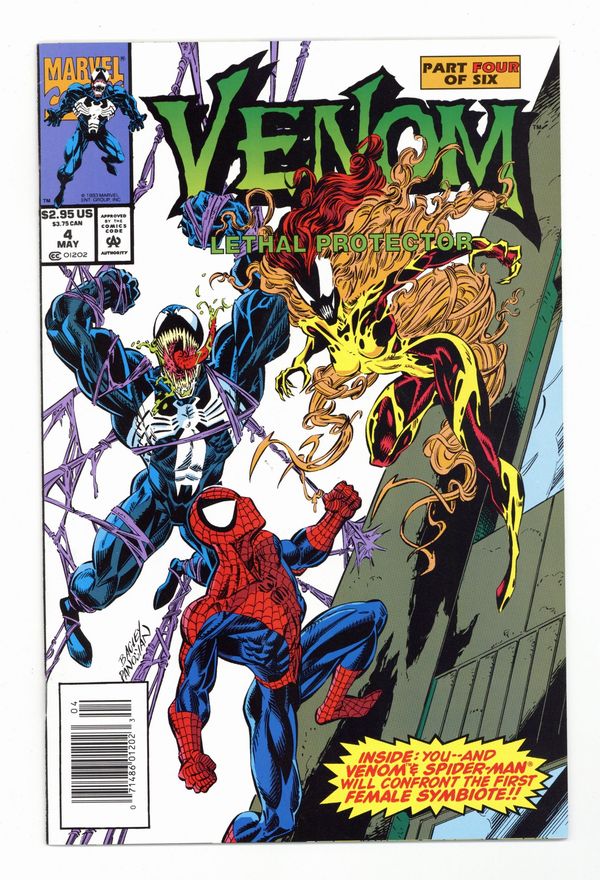 Tags: Spider-Man$10.50Newsstand Edition. The first female symbiote enters the scene! Spider-Man and Venom confront the Life Foundation's master plan, when a new killer symbiote is born. Written by David Michelinie. Art by Ron Lim, Sam de la Rosa and Al Milgrom. Cover by Mark Bagley and Dan Panosian. Cover price $2.95.