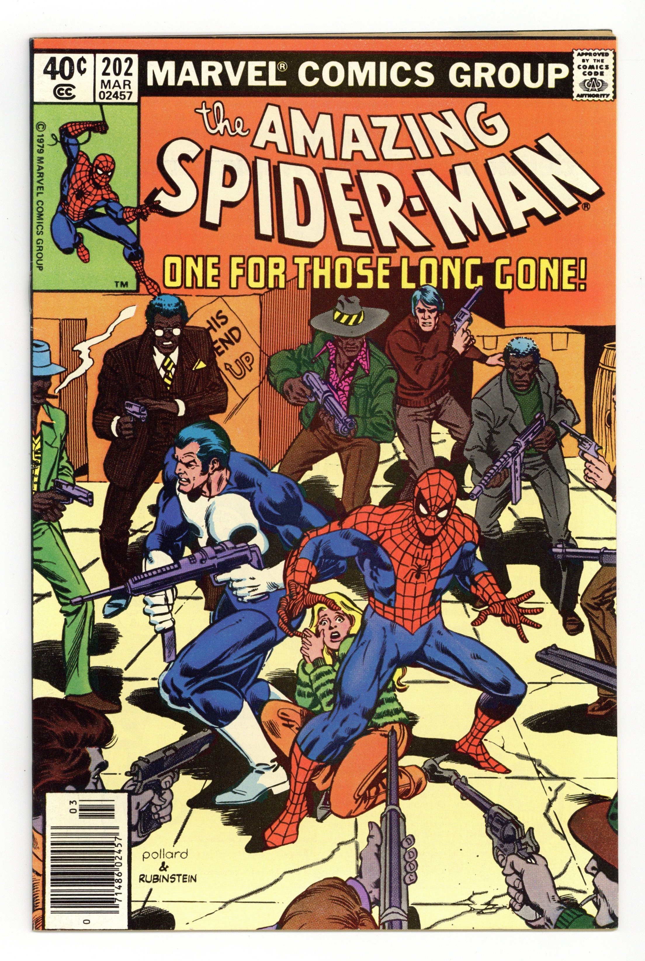 Newsstand Edition. "One for Those Long Gone!" Part 2 of 2. Guest-starring the Punisher. Script by Marv Wolfman. Art by Keith Pollard (breakdowns) and Jim Mooney (finishes). Cover by Keith Pollard and Joe Rubinstein. After surviving his nervous encounter with the Punisher, Peter Parker slips on his red and blue costume and joins the gun-toting vigilante's pursuit of the drug lords! Spider-Man wants to capture them. The Punisher wants to kill them. Something has got to give! Will the superhero or the anti-hero win the battle of wills? Cameo appearances by J. Jonah Jameson, Joe Robertson, and Dr. Jonas Harrow. (Notes: Spider-Man and the Punisher tangle again in Amazing Spider-Man Annual 15. This issue includes a sideways full-page ad featuring Batroc the Leaper promoting Crazy Magazine. This story was reprinted in Marvel Tales 219.) 36 pages Cover price $0.40.