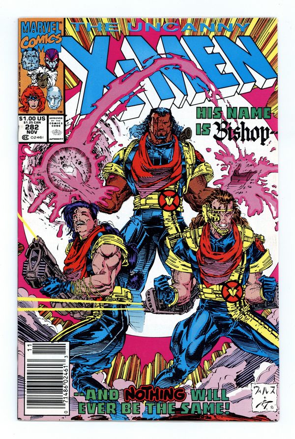 Newsstand Edition. "Payback!" Story by Whilce Portacio and John Byrne. Art by Whilce Portacio and Art Thibert. In one fell swoop the Upstarts have destroyed the Reavers and crippled the Hellfire Club. Next up, the Mutant Liberation Front. Who can stop these powerful new foes? Enter: Bishop! NOTE: 1st appearance of Bishop 40 pgs. Cover price $1.00.
