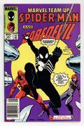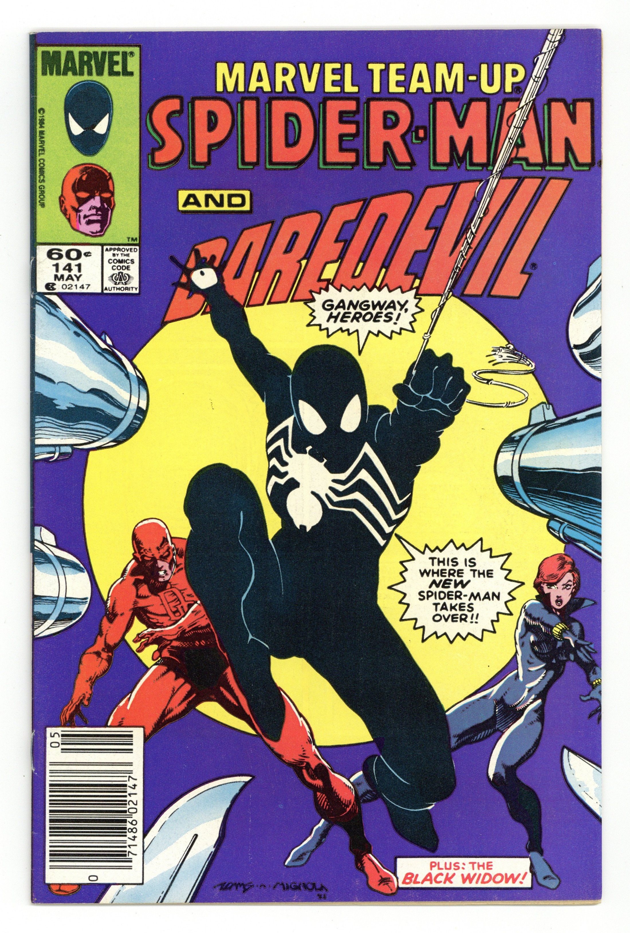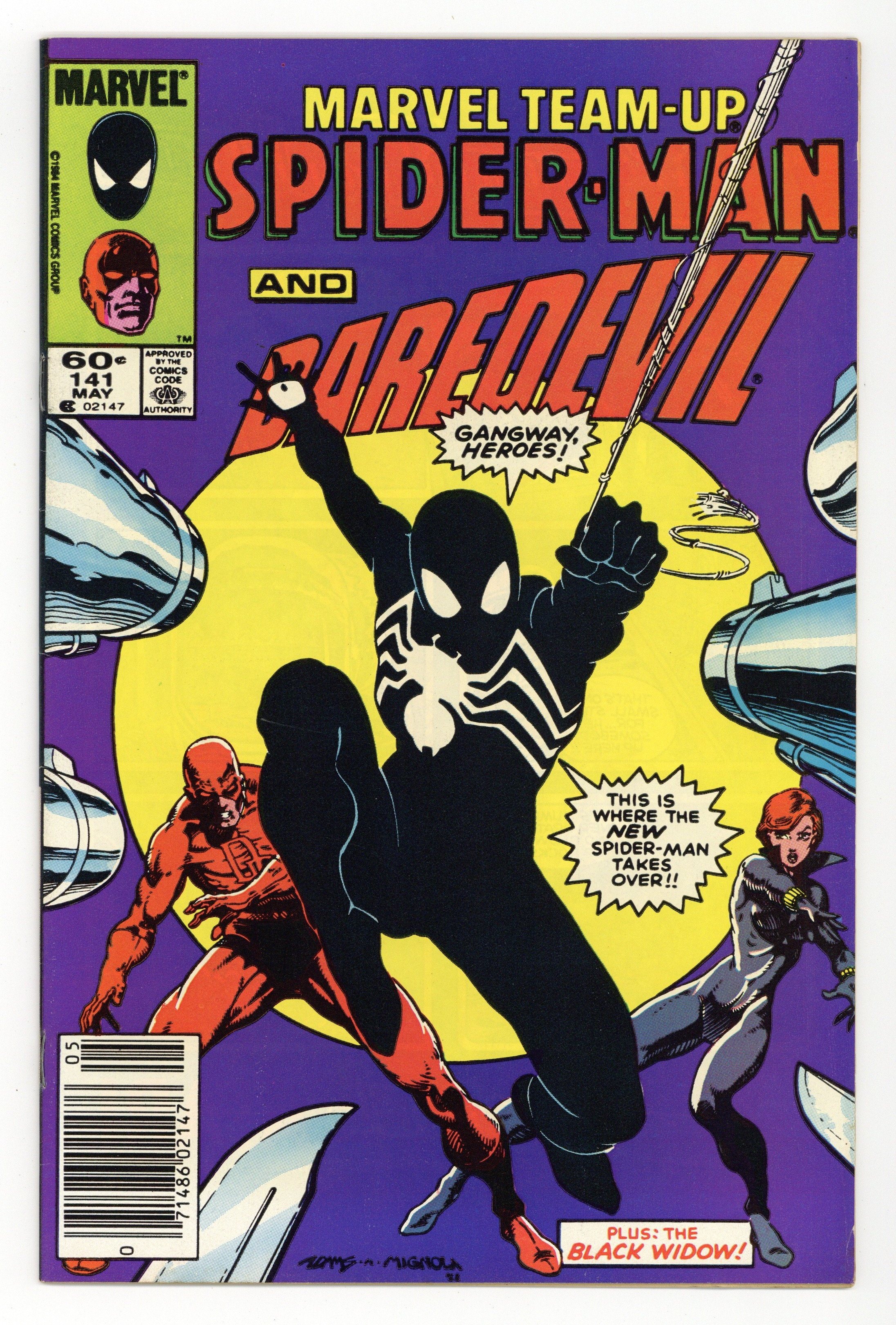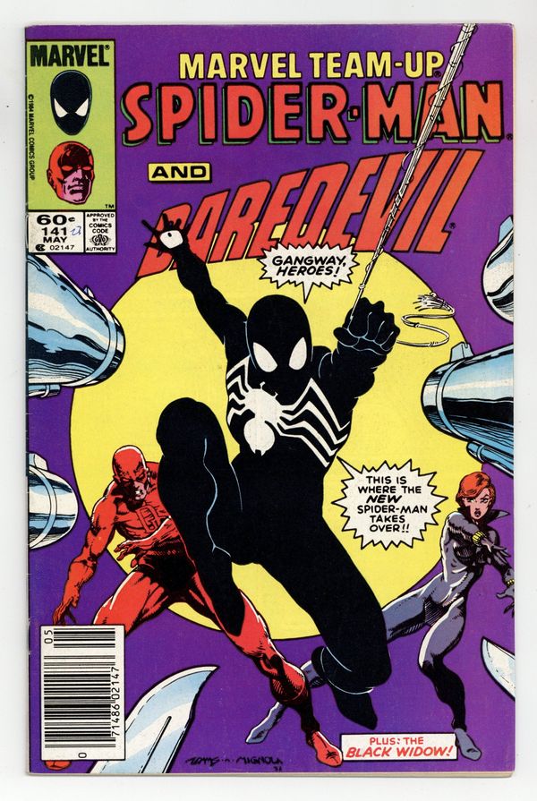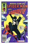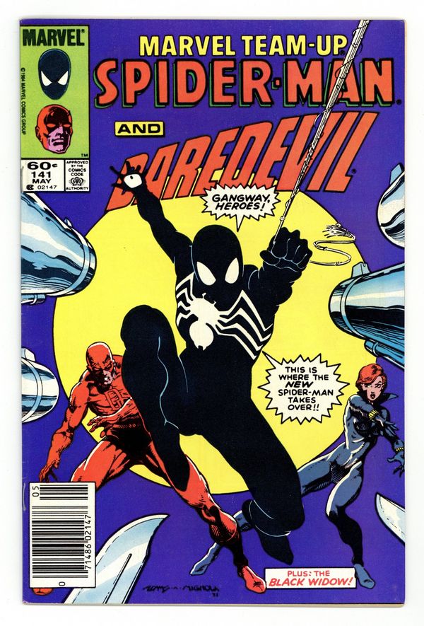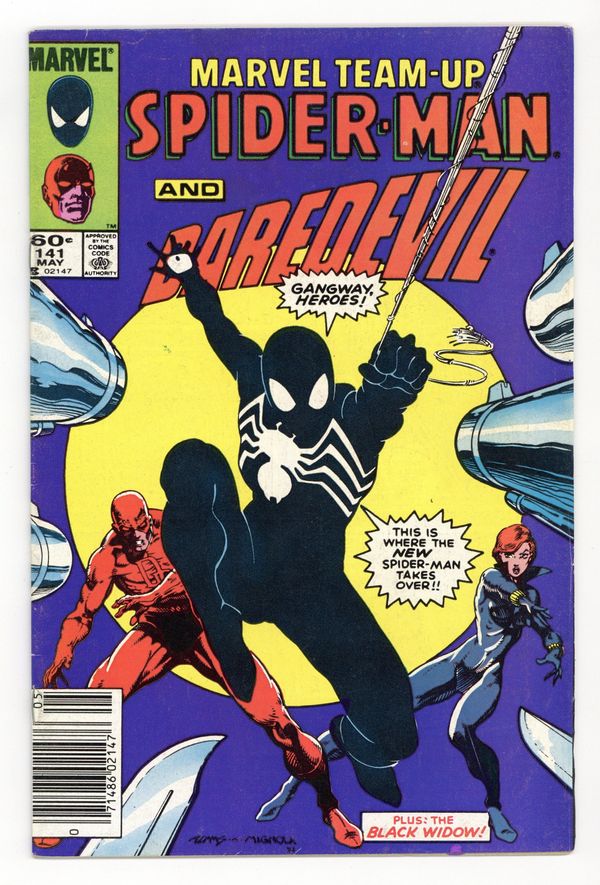 Newsstand Edition. "Blind Justice!" Part 2 of 2. Guest-starring Spider-Man, the Black Widow, and Daredevil. Plot by Tom DeFalco. Script by Jim Owsley. Art by Greg LaRocque (breakdowns) and Mike Esposito (finishes). Cover by Art Adams and Mike Mignola. Spider-Man is missing! What has happened to the spectacular one? Regardless, Daredevil and the Black Widow must keep working on the pawnbroker murder case in order to prevent an innocent man from going up the river! The Man Without Fear and Natasha just about have the case solved, when the web-slinger suddenly reappears...in a brand new costume! They'll be glad to have Spidey's help to finish this caper...or will they? Daredevil's deal with the Kingpin may not go over too well with your friendly neighborhood Spider-Man! Cameo appearances by the Kingpin, the Arranger, and Dr. Curt Connors. (Notes: Spider-Man's new costume debuted this month in Amazing Spider-Man 252, Spectacular Spider-Man 90, and this issue. The letters page includes a letter from Marvel creator Stan Lee.) 36 pages. Cover price $0.60.