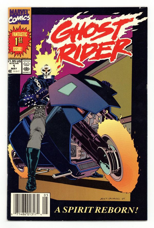 Newsstand Edition. "Life's Blood!" Written by Howard Mackie. Art by Javier Saltares and Mark Texeira. The Spirit of Vengeance returns! But who is this new Ghost Rider and what is his new mission. The House of Ideas redefines the supernatural for the 90s! Kingpin cameo. 32 pages, FC. NOTE: 1st appearance of Danny Ketch (Ghost Rider II) and 1st appearance of Deathwatch. Cover price $1.95.