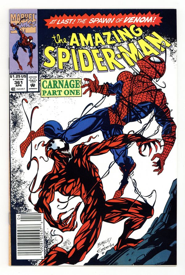First Printing. Newsstand Edition. First (full) appearance of Carnage in "Savage Genesis!" Part 1 of 3. Script by David Michelinie. Pencils by Mark Bagley. Inks by Randy Emberlin. Cover by Mark Bagley and Randy Emberlin. Blood runs in the streets as a serial killer roams New York City! And as the web-slinger investigates the murders, he notices a very disturbing similarity to another killer's modus operandi! In a burned-out building in Brooklyn, the spectacular one comes face-to-face with his new homicidal foe...Carnage! Can the wall-crawler end Cletus Kasady's rampage in their very first encounter? Cameo appearances by Aunt May and Mary Jane Watson. Flashback cameo by Venom. (Note: This three-part story was reprinted in 2011 in the trade paperback: Spider-Man -- The Vengeance of Venom.) 36 pages, full color. $1.25 cover price. NOTE: Most of these were distributed with slight printer tears in the bottom edge of the cover. Cover price $1.25.