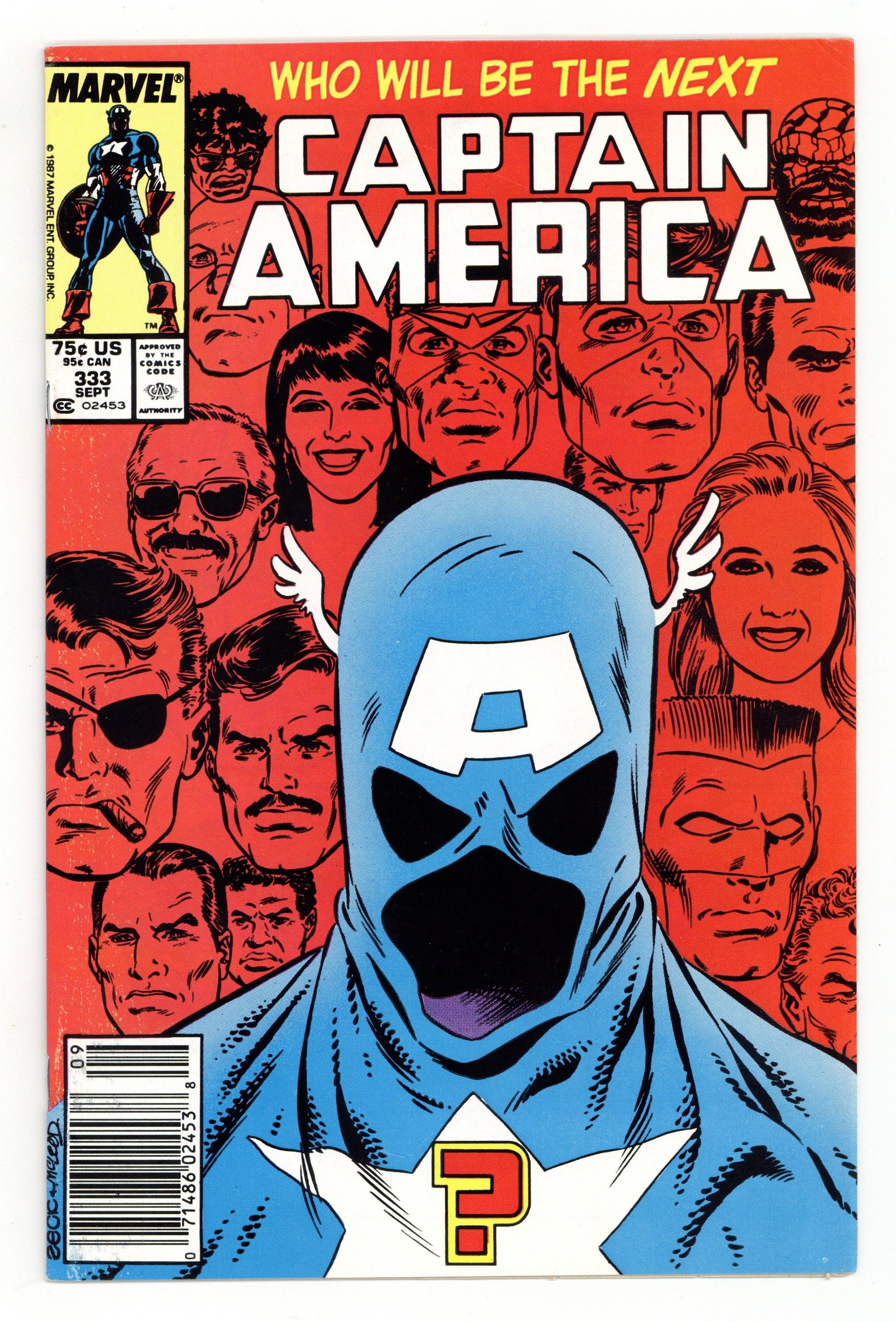 Newsstand Edition. Super Patriot (John Walker) becomes new Captain America. "The Replacement" Story by Mark Gruenwald. Art by Tom Morgan and Dave Hunt. Cover by Mike Zeck and Bob McLeod. The Commission is shocked by Steve Rogers' resignation and immediately begins a search for a new Captain America. Commission member Val Cooper has an idea: how about the Super-Patriot? John Walker accepts and becomes the next Captain America! (Note: Stan Lee is depicted on the left side of the cover.) 36 pages Cover price $0.75.