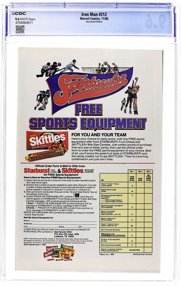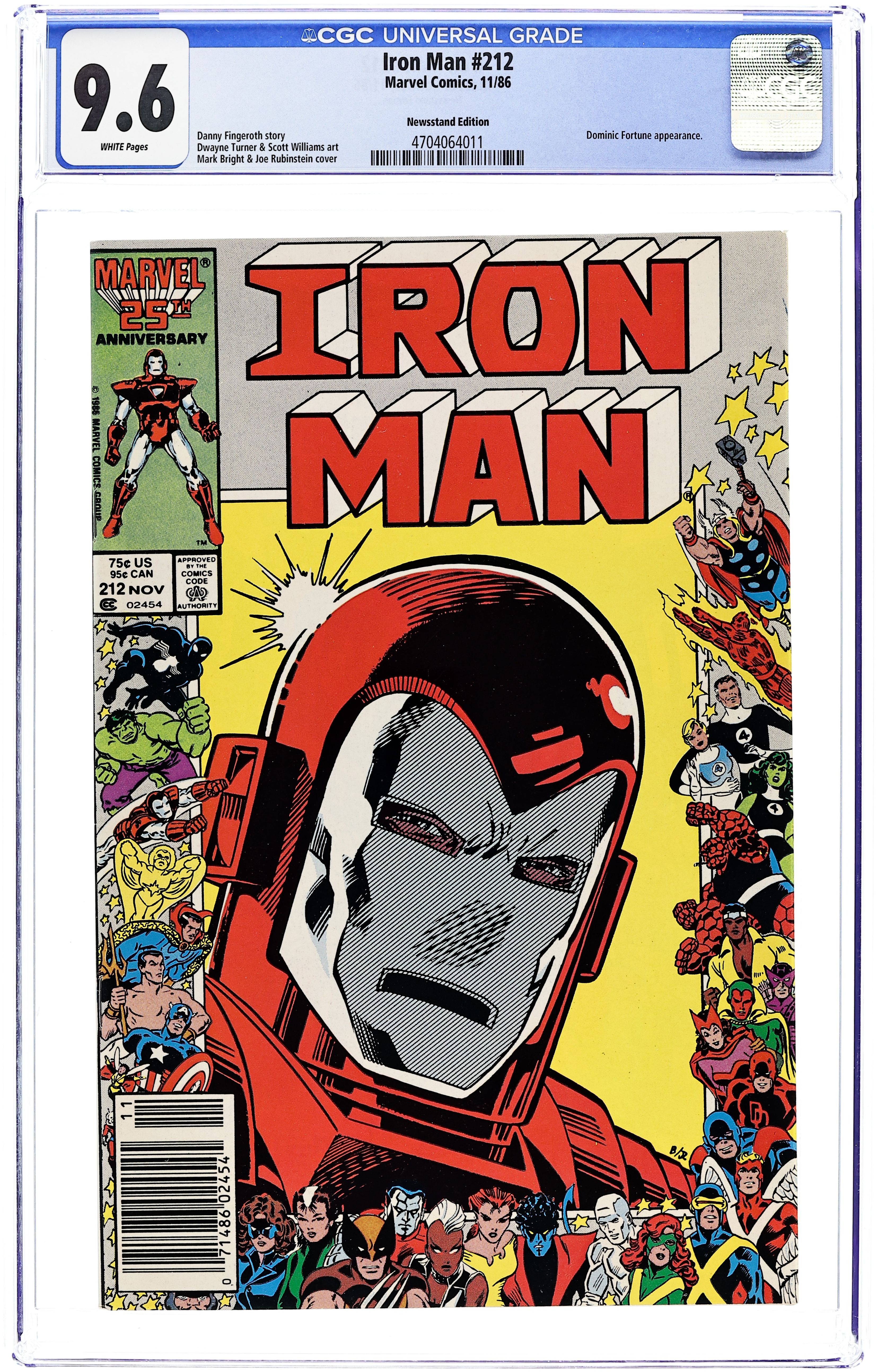 Newsstand Edition. Marvel 25th Anniversary Cover - "Precious Legacy" Part 1 of 2. Guest-starring Dominic Fortune. Script by Danny Fingeroth. Pencils by Dwayne Turner. Inks by Scott Williams. Cover by Mark Bright and Joe Rubinstein. Dominic Fortune (aka David Fortunov) is still searching for Simon Steele and Sabbath Raven! And when he learns that they are in California, he rushes to the west coast despite the protests of his son Jerry! Once there Dominic tracks Steele to an electronics trade show where Tony Stark's new company has an exhibit! And that's a good thing! Because once Iron Monger shows up, the aging brigand-for-hire will need Iron Man! Appearances by Clytemnestra Erwin, Jim Rhodes, and Elena von Lundt. Flashback cameos by Sabbath Raven and Spider-Man. (Note: Dominic Fortune previously appeared in Web of Spider-Man (1985 1st series) #10.) 32 pages. Cover price $0.75.