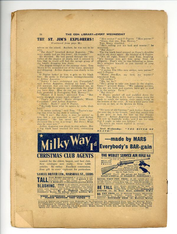 UK story magazine published by Amalgamated Press between 1907-1939, predominantly featuring the activities of boys at the fictional school St. Jim's. 6.75" x 9.5", 36 pages, B&W