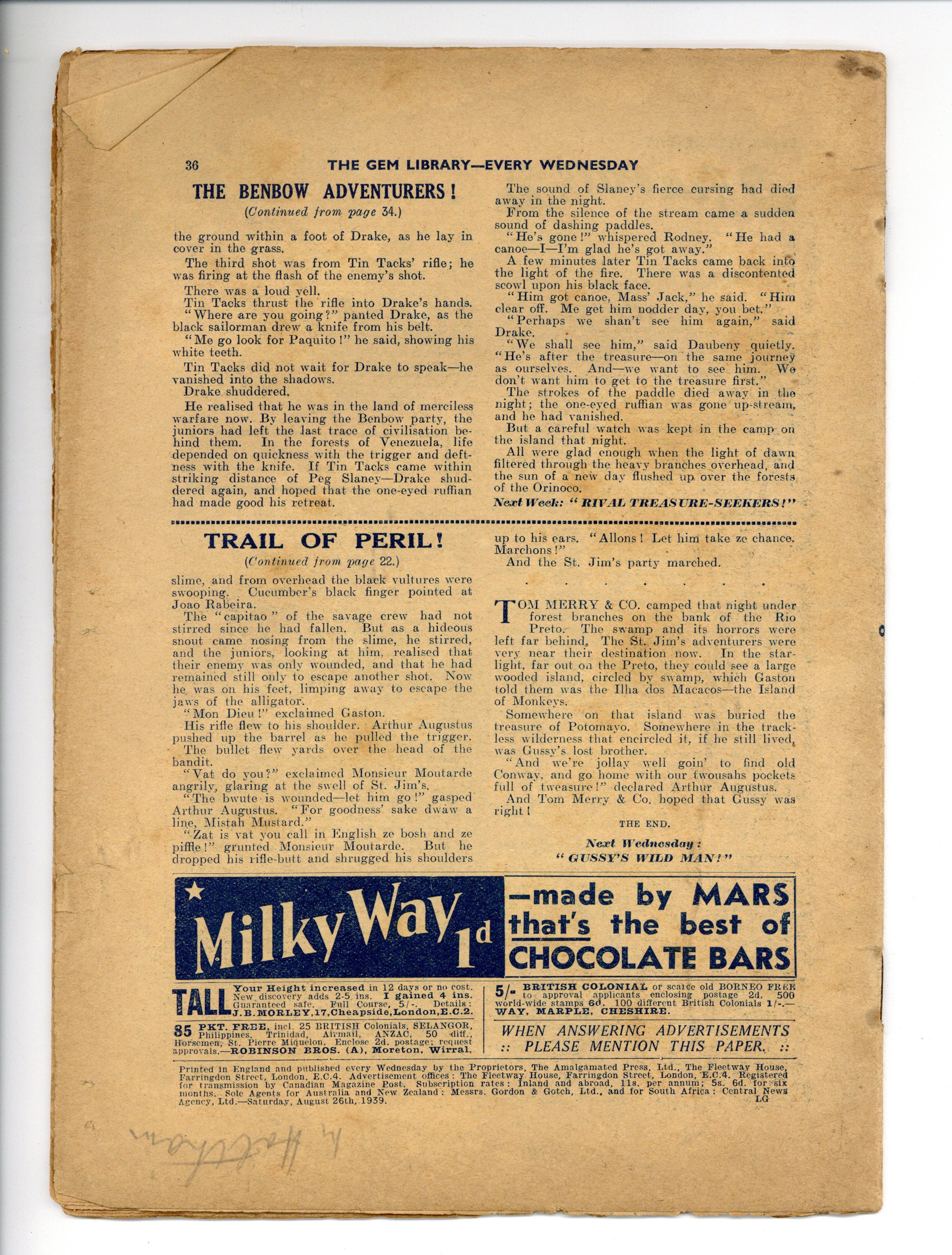 UK story magazine published by Amalgamated Press between 1907-1939, predominantly featuring the activities of boys at the fictional school St. Jim's. 6.75" x 9.5", 36 pages, B&W