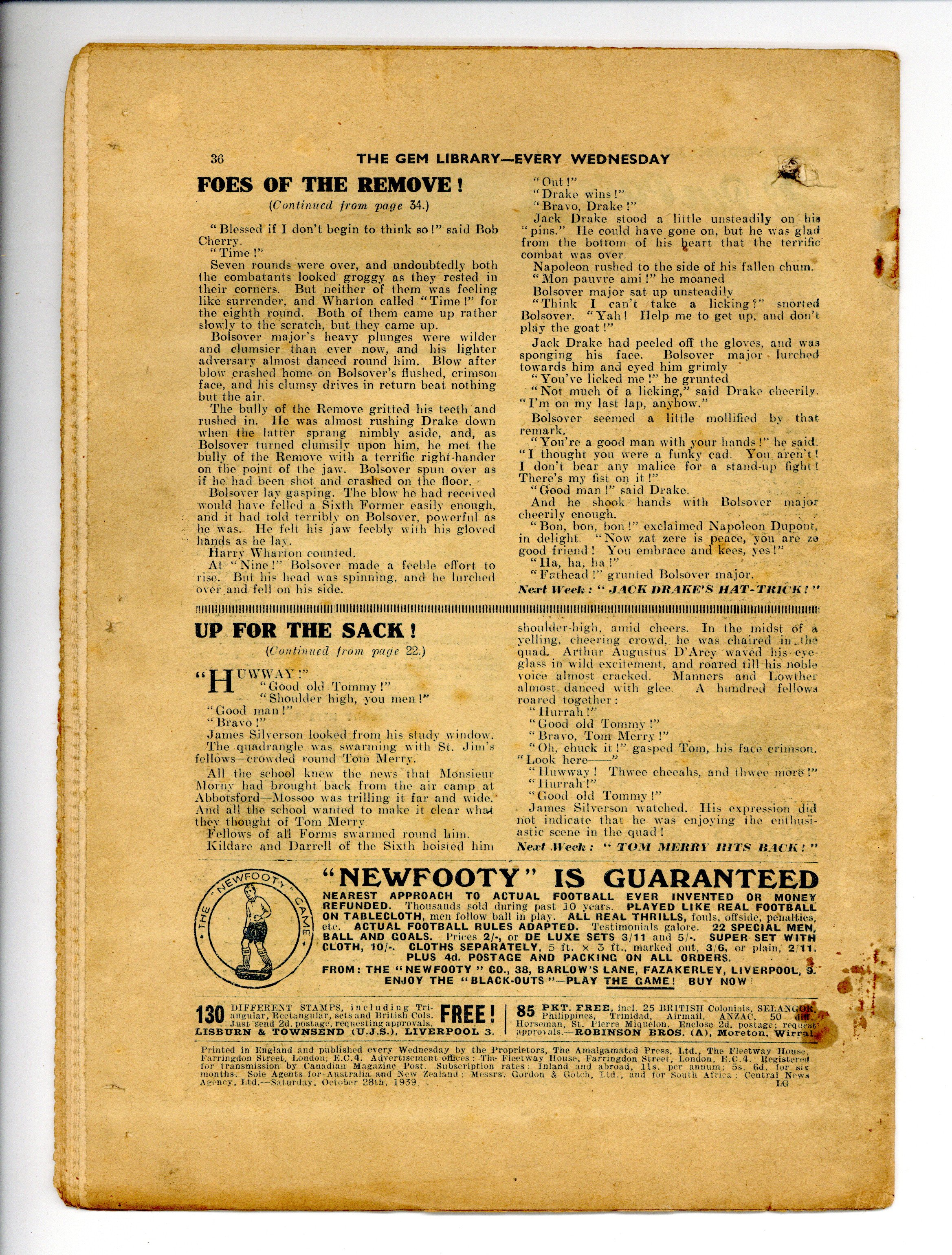 Published Oct 1939 by Amalgamated Press.$2.65- Spine split 5%. Cover Detached. Staple rust: Extensive.