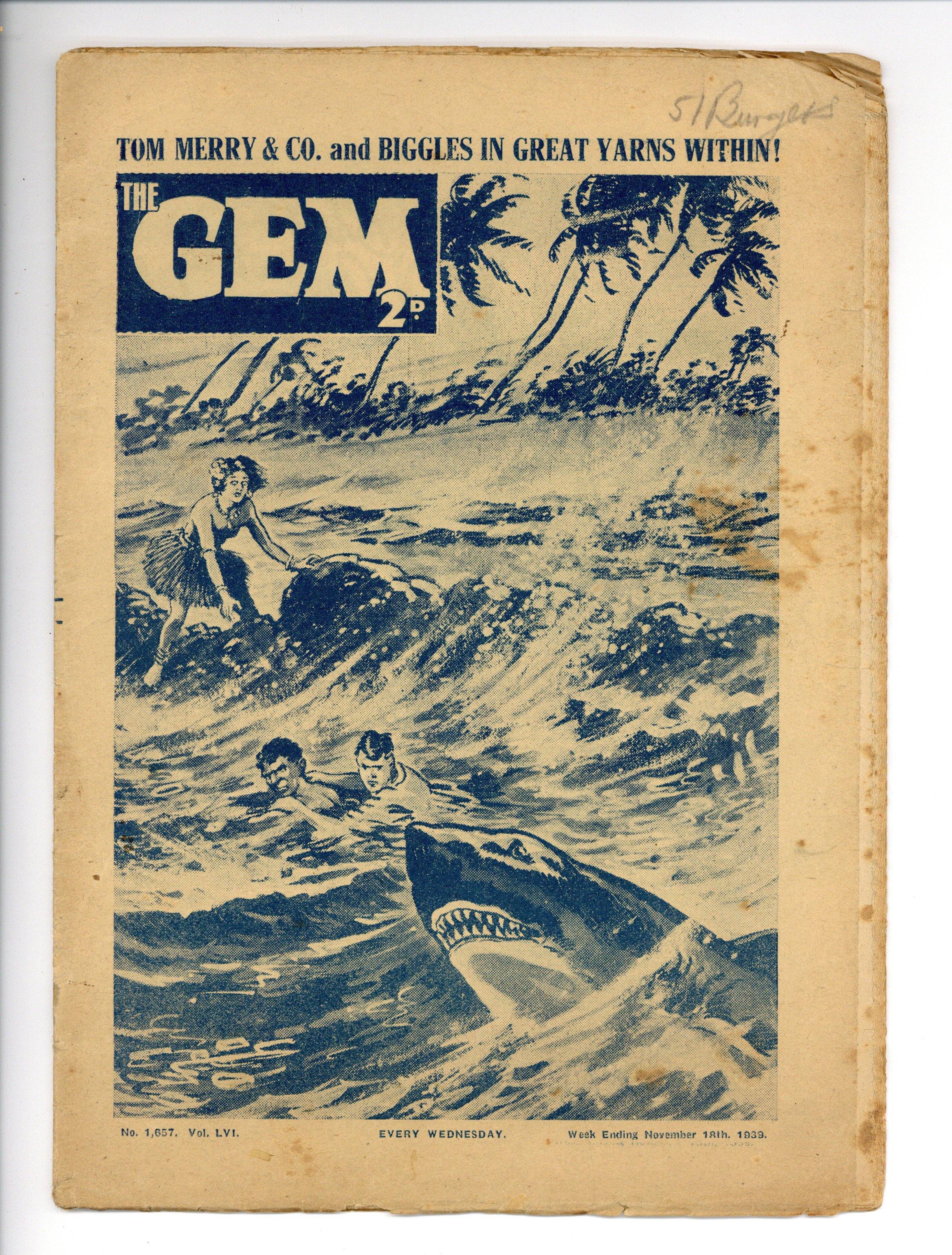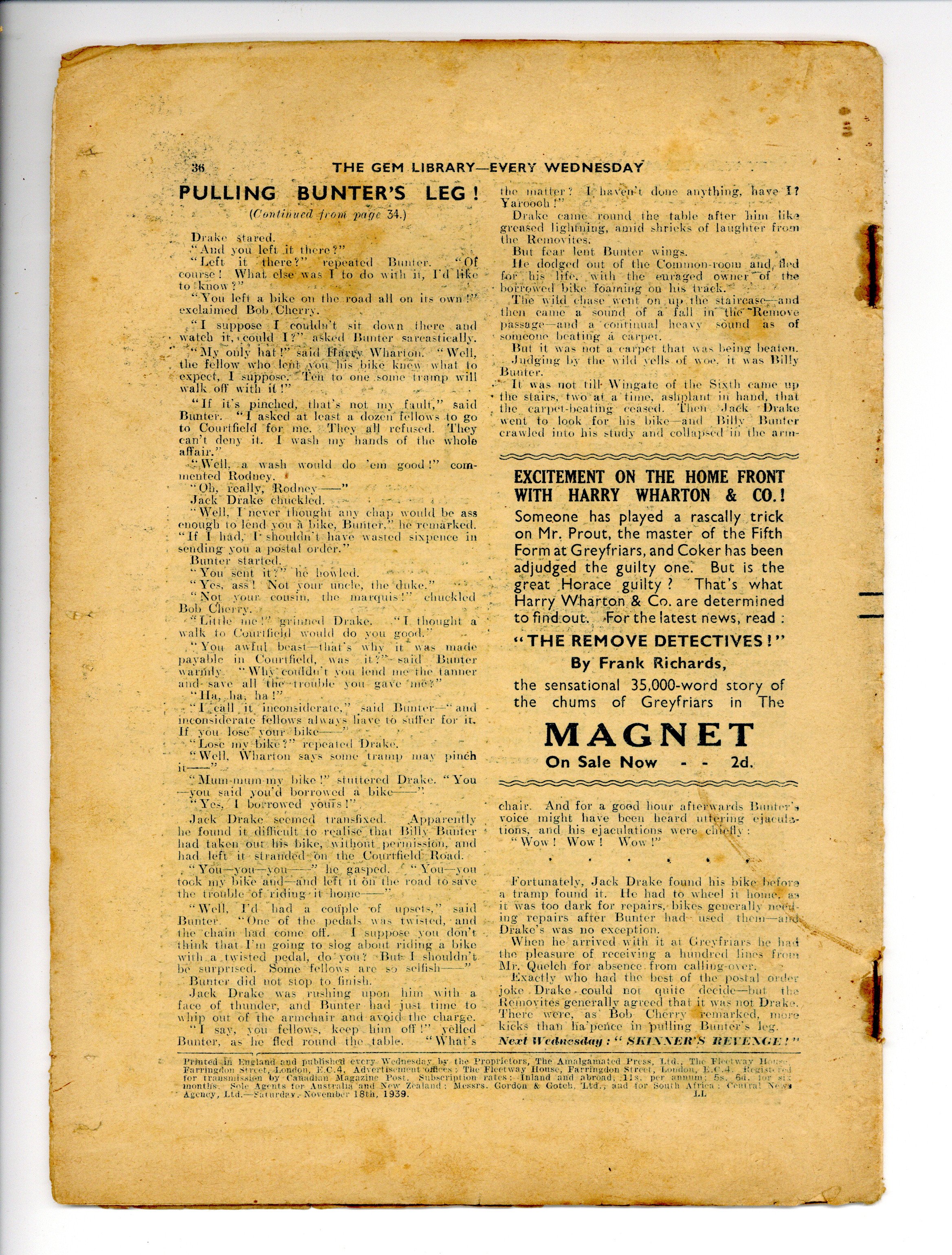 UK story magazine published by Amalgamated Press between 1907-1939, predominantly featuring the activities of boys at the fictional school St. Jim's. 6.75" x 9.5", 36 pages, B&W