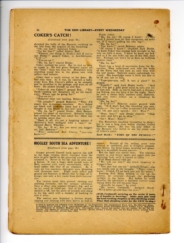UK story magazine published by Amalgamated Press between 1907-1939, predominantly featuring the activities of boys at the fictional school St. Jim's. 6.75" x 9.5", 36 pages, B&W