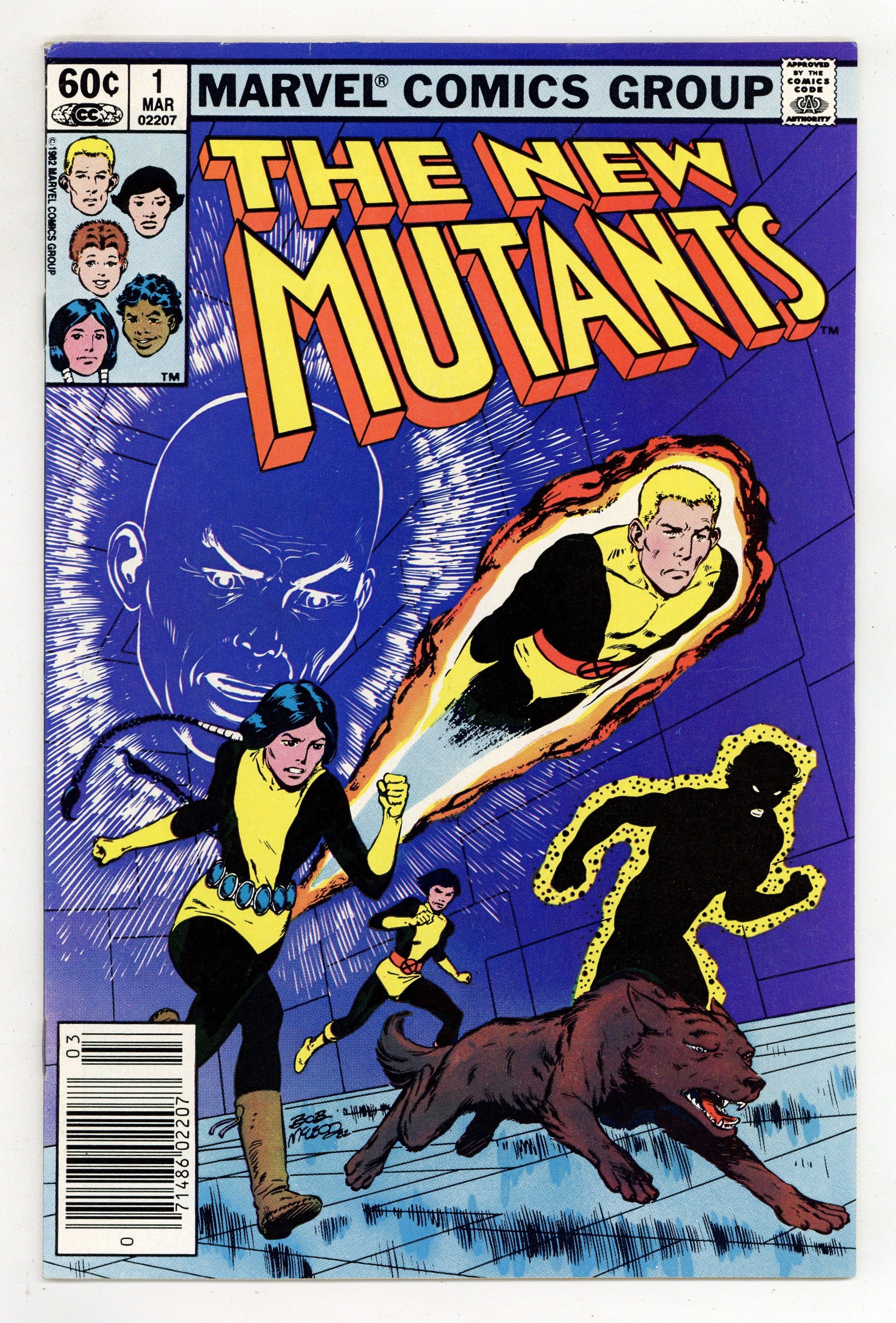 Newsstand Edition. Regular series begins (first appearance is in Marvel Graphic Novel 4). Cover art by Bob McLeod. Initiation!, script by Chris Claremont, pencils by Bob McLeod, inks by Mike Gustovich; The New Mutants get acclimated to their new home, new talents, new friends, and new teachers, unaware that they are being watched; Moira learns that Professor X has a son; and Psyche is attacked in the Danger Room by an unknown assailant; Origin of Karma. Second appearance of the New Mutants (after Marvel Graphic Novel #4). Cover price $0.60.