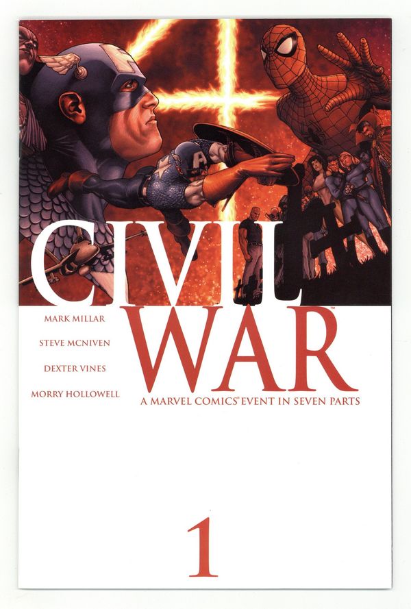 Tags: Civil War (Marvel) (part 1)$20.00Written by Mark Millar. Pencils & Wraparound Cover by Steve McNiven. A conflict has been brewing in the Marvel Universe for over a year, threatening to pit friend against friend, brother against brother--and all it will take is a single misstep to cost thousands their lives and ignite the fuse! As the war claims its first victims, no one is safe as teams, friendships, and families begin to fall apart. Civil War, a Marvel Comics event in seven parts, stars Spider-Man, the New Avengers, the Fantastic Four, the X-Men and the entirety of the Marvel pantheon! Cover price $3.99.