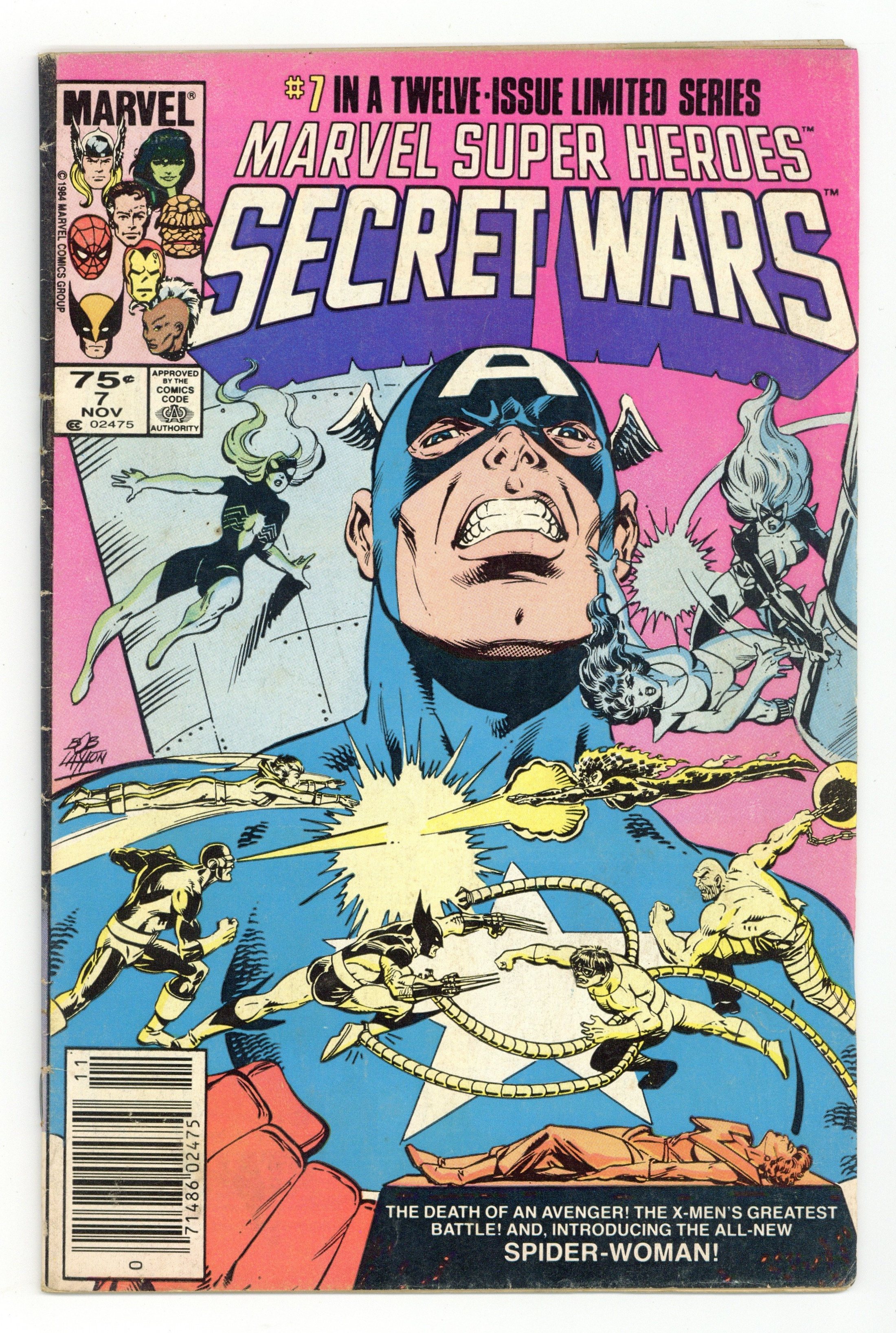 Newsstand Edition. 1st appearance of Spider-Woman II (Julia Carpenter). "Berserker!" Part 7 of 12. Story by Jim Shooter. Art by Mike Zeck and John Beatty. Introducing Marvel's newest super-hero, Spider-Woman, a refugee from the displaced Denver, Colorado (NOTE: The Beyonder created Battleworld from pieces of hundreds of worlds from across the universe, Denver was one of those pieces). Plus, when the villains dump the Wasp's lifeless body into the heroes' camp, the Savage She Hulk decides to pay the bad guys a visit for some payback. But, has the emerald heroine finally bitten off more than she can chew? 36 pages, full color. Cover price $0.75.