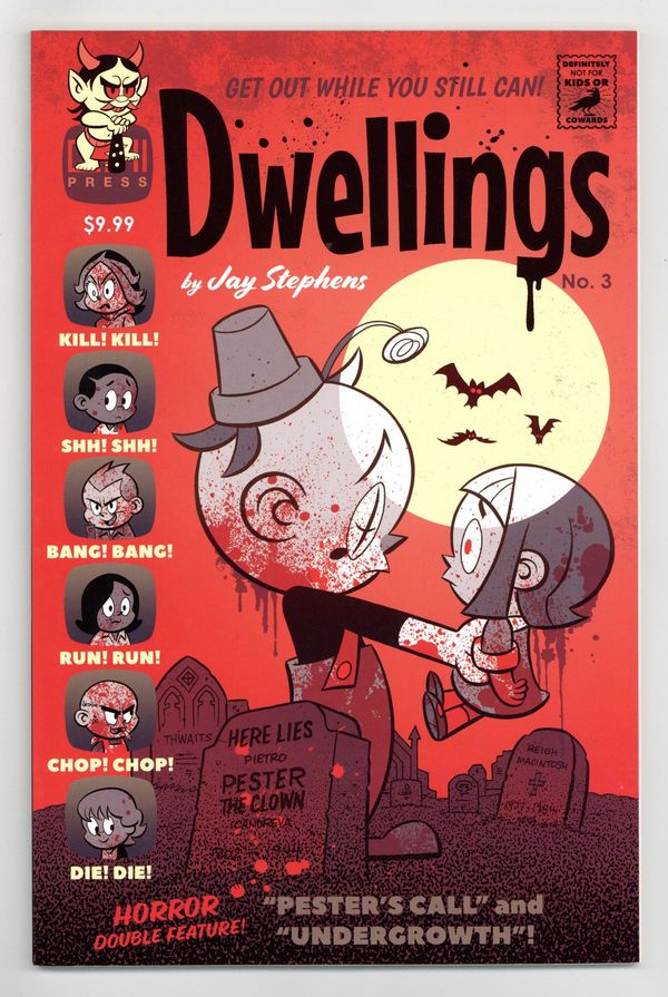 $8.00Limited 1 for 10 Retailer Incentive Variant Cover. Story by Jay Stephens. The sold-out horror hit of 2023 returns to the scene of the crime for one FINAL scare! Welcome back to Elwich-where murderous and horrifying secrets sleep just below the pristine surface, slithering in the shadows of this otherwise quiet and idyllic small town. The cute-creepy mashup from Emmy Awardwinning, Eisner Award-nominated cartoonist and animator Jay Stephens (Secret Saturdays, Jetcat Clubhouse) returns from the grave for two more tales of small-town horror. Readers with coulrophobia beware: in this issue, creepy clowns are quite the scare! See for yourself the shock, terror, and fun that is . . . Dwellings! 72 pages, full color. Rated M Cover price $9.99.