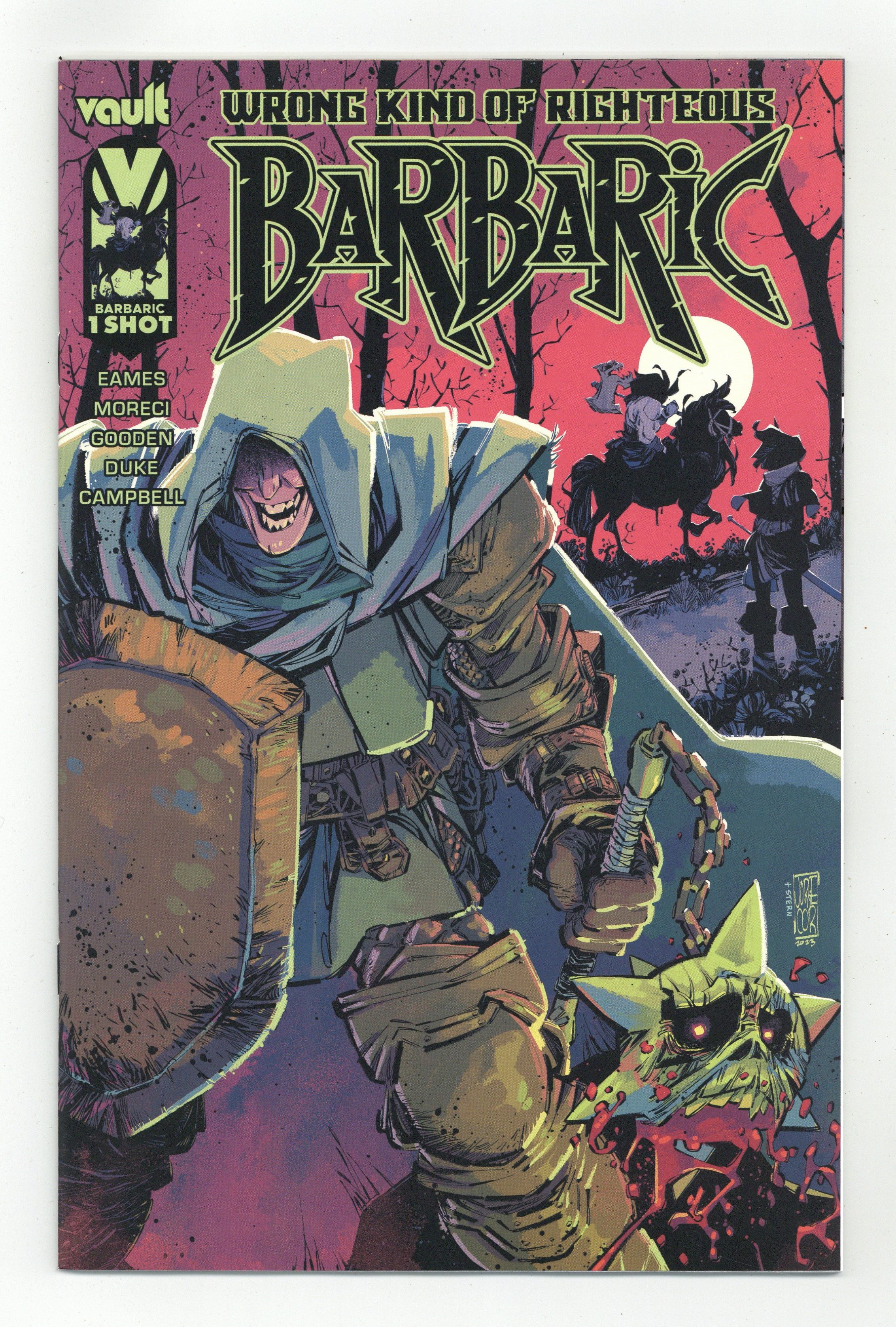 Published Nov 2023 by Vault Comics.$6.40Written by Michael Moreci, Nicholas Eames. Art by Nathan Gooden. Cover by Jorge Corona. Double-sized one-shot introducing an all-new talking weapon, Flail! Best-selling, Gemmell Award-winning Fantasy author Nicholas Eames (Kings of the Wyld) teams up with Michael Moreci, Nathan Gooden, and Julius Ohta to tell the tale of Sir Borys the Righteous Paladin and his trusty, talking Flail, as he enlists the help of Owen, Axe, and Soren on his noble path. There will be virtuous bloodshed! There will be wailing protests! There will be two talking weapons! And there will be wyvern burgers served (for better or worse) with pickles! 48 pages, full color. Cover price $19.98.