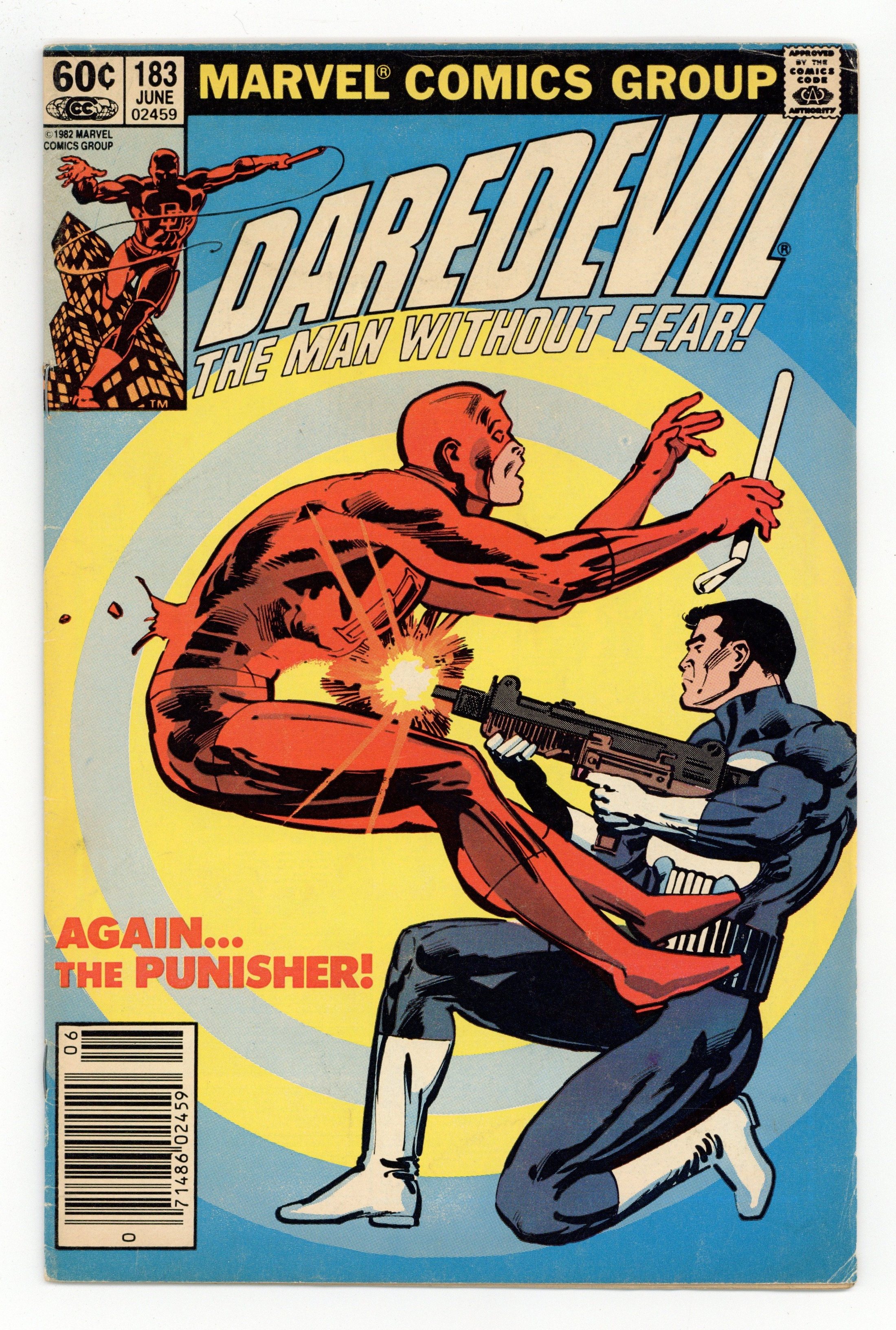 Newsstand Edition. Cover pencils by Frank Miller, inks by Klaus Janson. Child's Play, script by Roger McKenzie and Frank Miller, pencils by Frank Miller (breakdowns) and Klaus Janson (finished art), inks by Klaus Janson; A young girl on drugs takes a dive out of her school window and dies, and her brother, DD and the Punisher are all trying to track down the dealer responsible; Matt proposes to Heather; Hogman [Peter Grunter] is the guest villain. The last few pages are probably penciled by Janson from Miller breakdowns. This story was originally scheduled for issue 167 but delayed because the Comics Code did not approve it in its original form. 36 pgs. Cover price $0.60. Cover price $0.60.