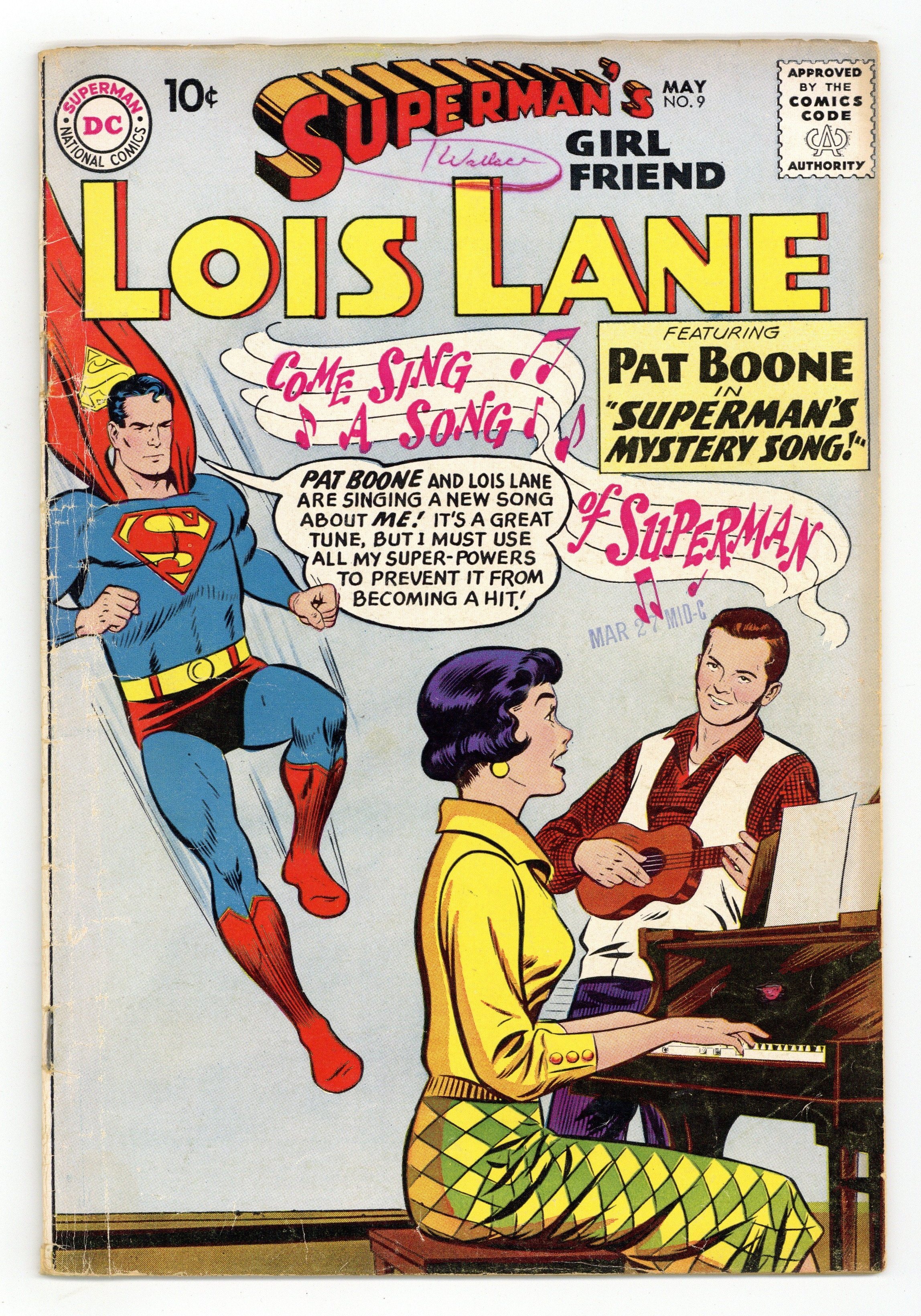Ends Feb 16 9:37 PM CST Bid History 9 bids Current Bid $27 Your Secret Max Bid If you'd like to bid, please log in or register. Cover pencils by Curt Swan, inks by Stan Kaye. The Most Hated Girl in Metropolis!, script by Robert Bernstein, art by Kurt Schaffenberger; When a story that Lois had written and subsequently discarded is found by the Daily Planet copy boy and published, everyone believes Lois has deliberately revealed Superman's secret identity. Lois Lane's Stone-Age Suitor!, script by Robert Bernstein, art by Kurt Schaffenberger; Clark and Lois are marooned on an island full of cavemen. Superman's Mystery Song!, script by Robert Bernstein, pencils by Dick Sprang; Saving Pat Boone from his fans after a concert, Superman delivers him safe and sound to the Daily Planet, where Lois and Clark practice a song for a variety show. 36 Pages, Full Color. Cover price $0.10.