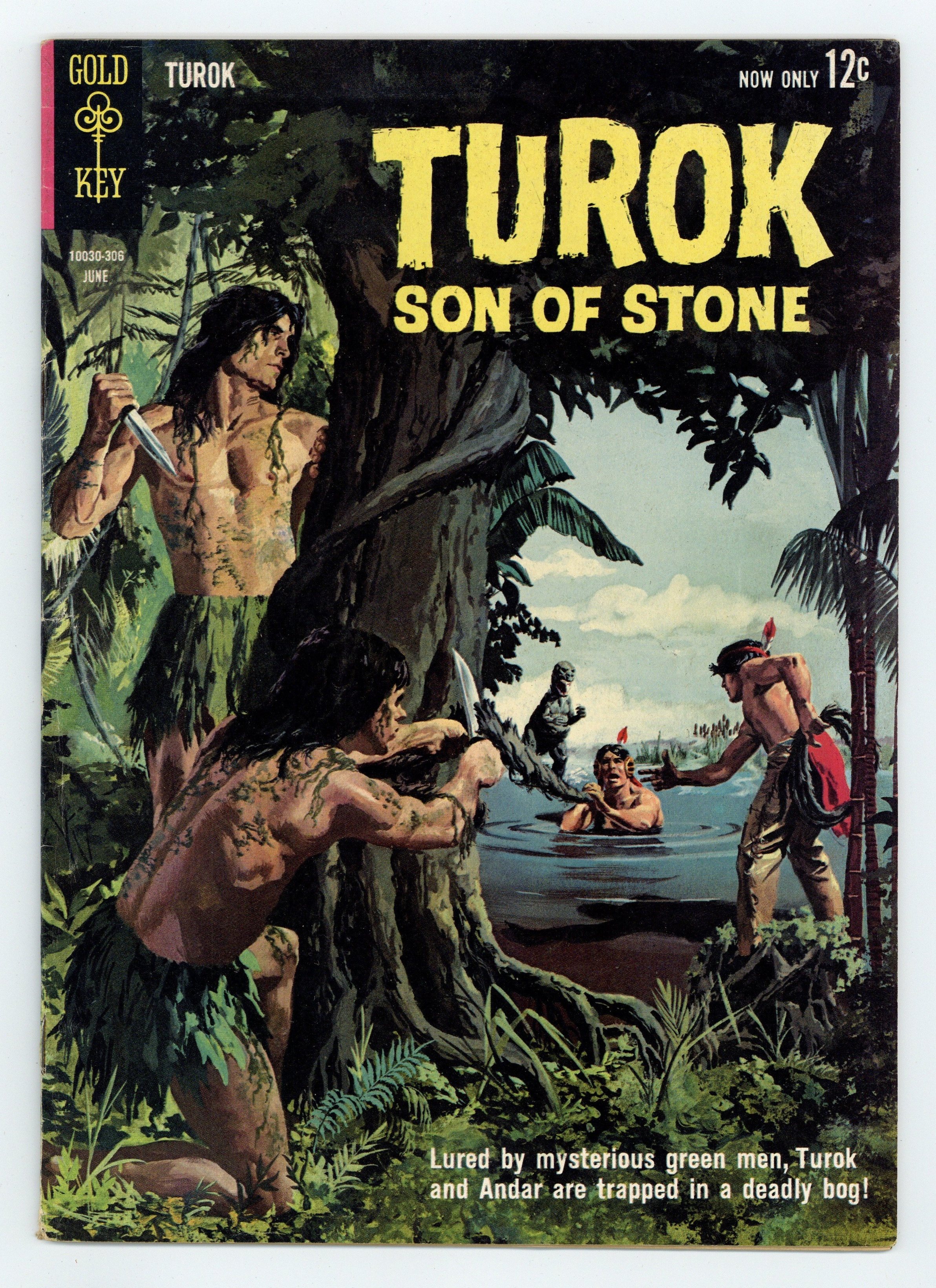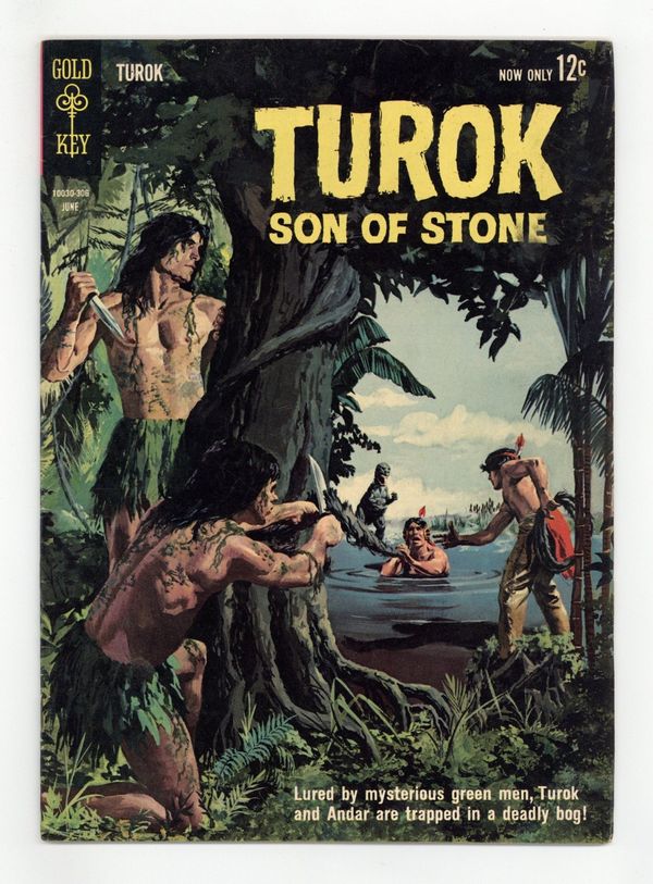 Painted cover. Turok in "Terror of the Bog" in which Turok and Andar find danger and conflict in a swampy area of lost valley and "Dangerous Friends" in which Turok and Andar face danger from Andar's new friends. Issue also has backup feature "Young Earth - Creatures of the Cave," a one-page text feature "Man's Earliest Weapon," and one-page strips. No art/story credits given. No ads in book. Entire issue from cover to cover is comic stories and one-page strips. Back cover is pinup of front cover illustration. 36 pages, full color. Cover price $0.12.