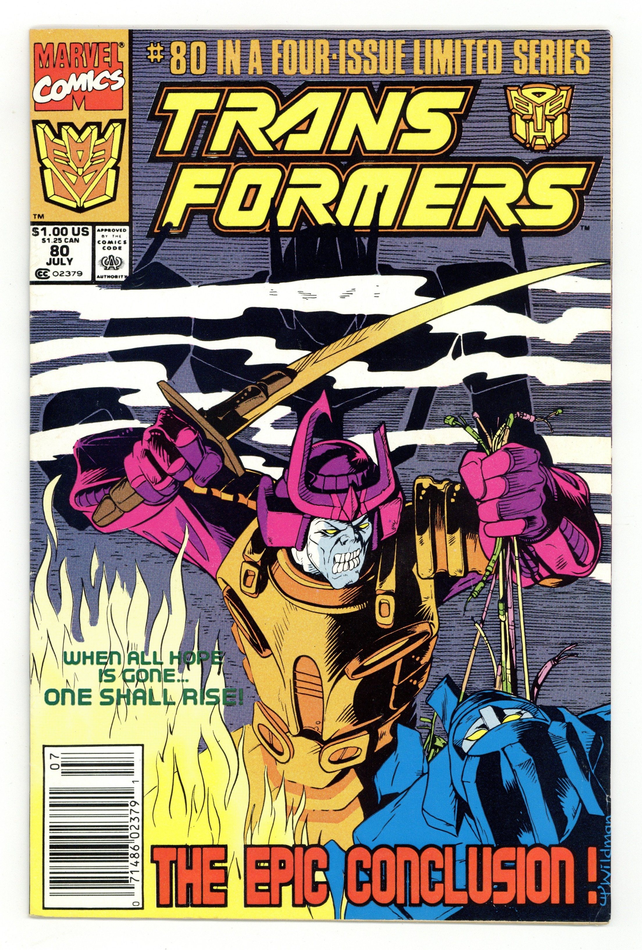 Tags: Transformers$90.00Newsstand Edition. Cover pencils by Andrew Wildman, inks by Stephen Baskerville. "End of The Road!", script by Simon Furman, pencils by Andrew Wildman, inks by Stephen Baskerville; The Autobots have lost on Klo to the Decepticons; All hope seems to be lost until Optimus Prime is reborn by the Last Autobot using Hi-Q (with Prime's memories) as the template; The defeated Decepticons then leave Klo, but plot other plans against the Autobots. 36 pgs., full color. Cover price $1.00.