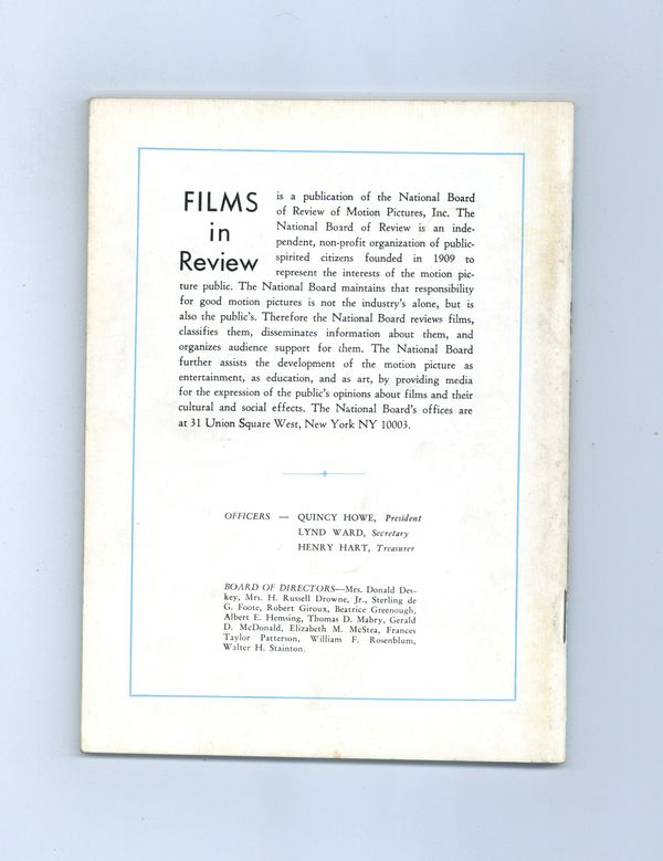 Published Oct 1967 by National Board of Review of Motion Pictures Inc..$11.00Film in Review is a publication of the National Board of Review of Motion Pictures, Inc, an independent, non-profit organization of public citizens founded in 1909 to represent the interests of the motion picture public. This National Board further assists the development of the motion picture as a source of entertainment, as education, and as art, by providing media for the expression of the public's opinion about films and their cultural and social effects. 5 1/2-in. x 7 1/2-in., 70 pages, B&W. Print error: Labeled as issue 7 instead of 8. Cover price $0.75.