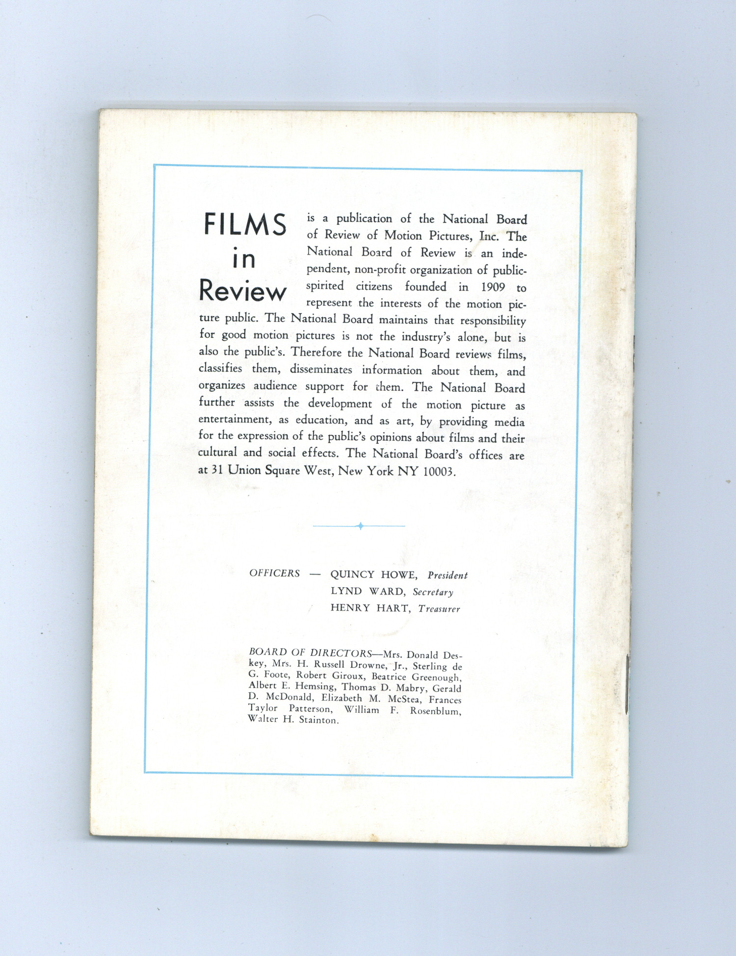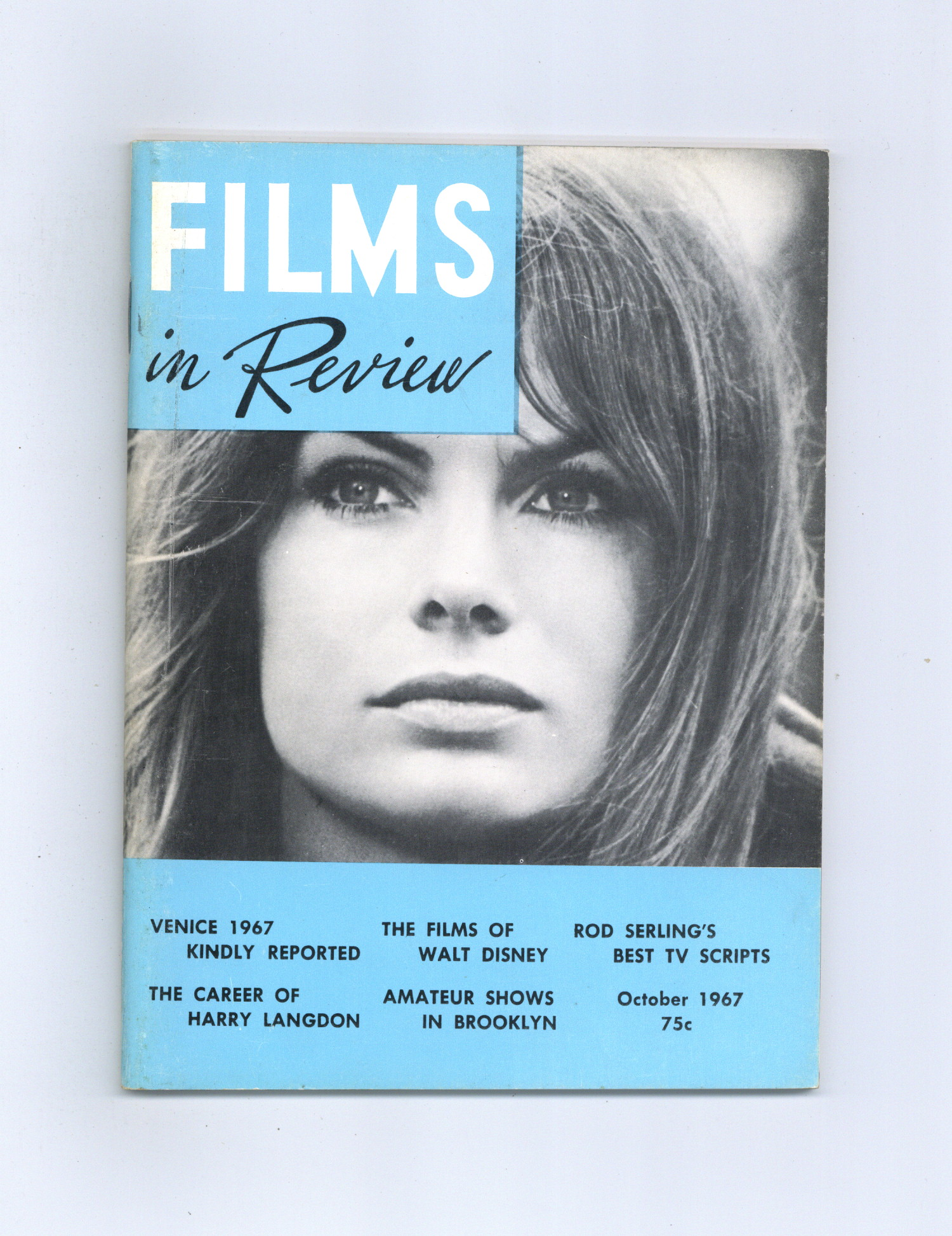 Published Oct 1967 by National Board of Review of Motion Pictures Inc..$15.00Film in Review is a publication of the National Board of Review of Motion Pictures, Inc, an independent, non-profit organization of public citizens founded in 1909 to represent the interests of the motion picture public. This National Board further assists the development of the motion picture as a source of entertainment, as education, and as art, by providing media for the expression of the public's opinion about films and their cultural and social effects. 5 1/2-in. x 7 1/2-in., 70 pages, B&W. Print error: Labeled as issue 7 instead of 8. Cover price $0.75.