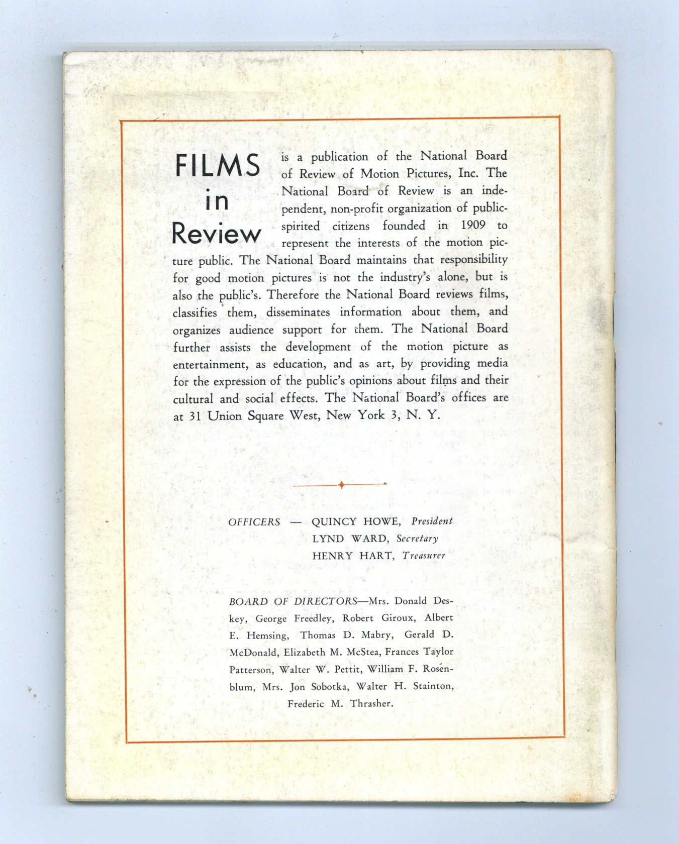 Published Feb 1961 by National Board of Review of Motion Pictures Inc..$5.40- Staple rust: Slight.