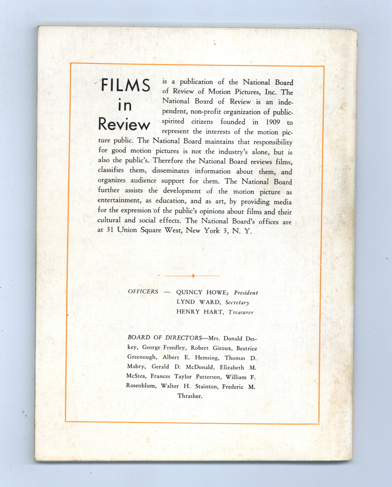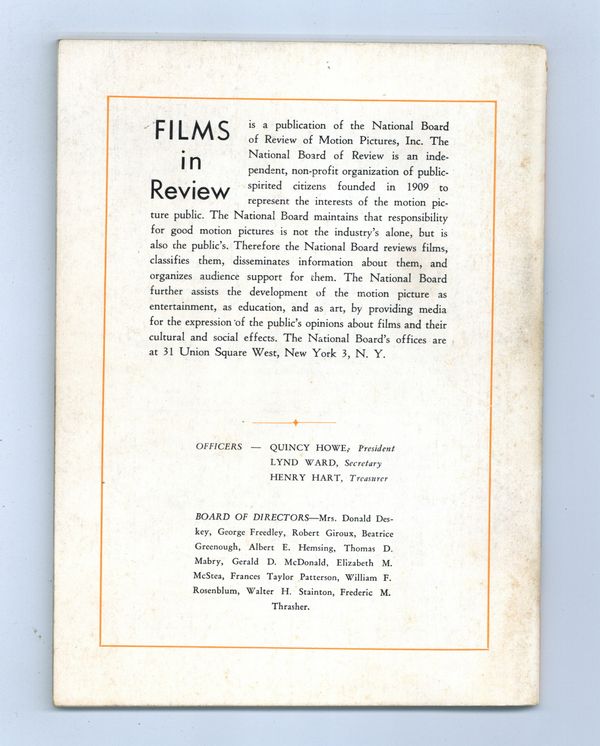 Film in Review is a publication of the National Board of Review of Motion Pictures, Inc, an independent, non-profit organization of public citizens founded in 1909 to represent the interests of the motion picture public. This National Board further assists the development of the motion picture as a source of entertainment, as education, and as art, by providing media for the expression of the public's opinion about films and their cultural and social effects. 5 1/2-in. x 7 1/2-in., 70 pages, B&W. Cover price $0.60.