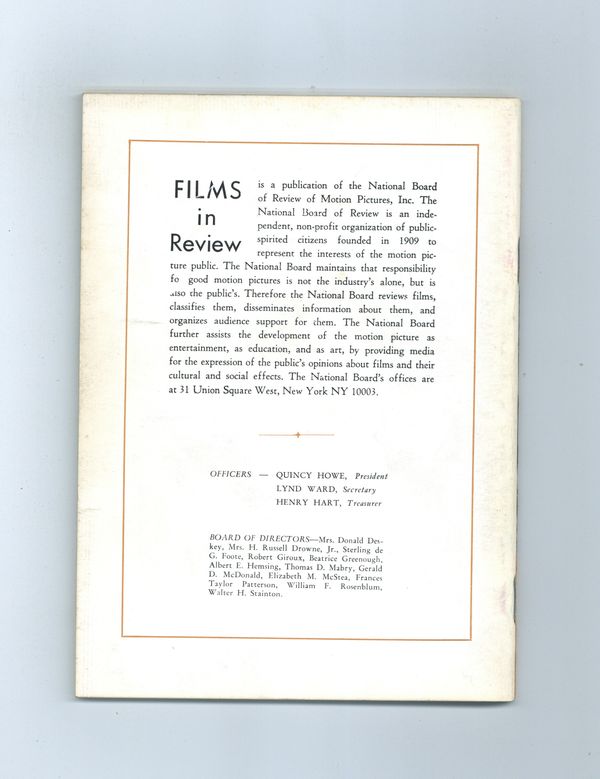 Film in Review is a publication of the National Board of Review of Motion Pictures, Inc, an independent, non-profit organization of public citizens founded in 1909 to represent the interests of the motion picture public. This National Board further assists the development of the motion picture as a source of entertainment, as education, and as art, by providing media for the expression of the public's opinion about films and their cultural and social effects. 5 1/2-in. x 7 1/2-in., 70 pages, B&W. Cover price $0.75.