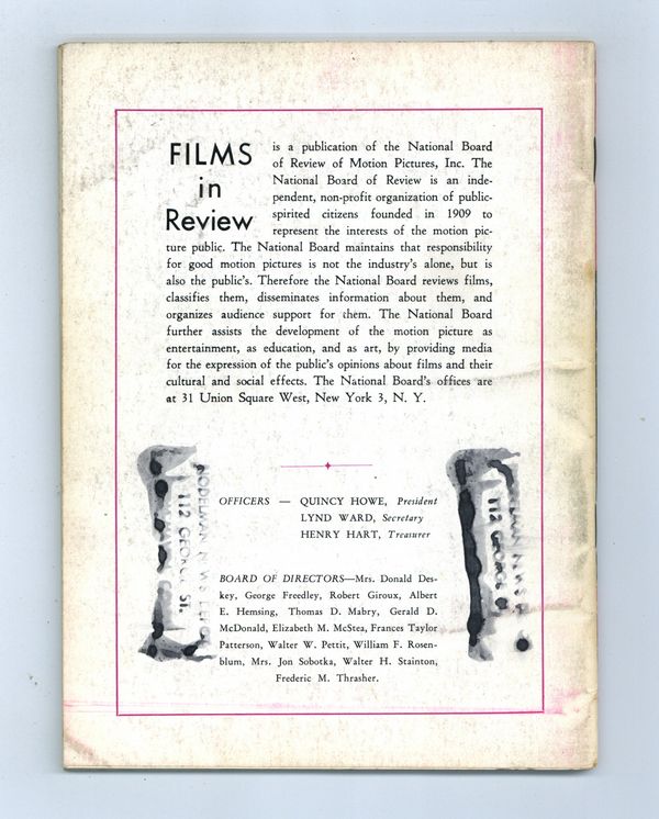 Film in Review is a publication of the National Board of Review of Motion Pictures, Inc, an independent, non-profit organization of public citizens founded in 1909 to represent the interests of the motion picture public. This National Board further assists the development of the motion picture as a source of entertainment, as education, and as art, by providing media for the expression of the public's opinion about films and their cultural and social effects. Plus movie reviews and letters. 5 1/2-in. x 7 1/2-in., 70 pages, B&W. Cover price $0.60.