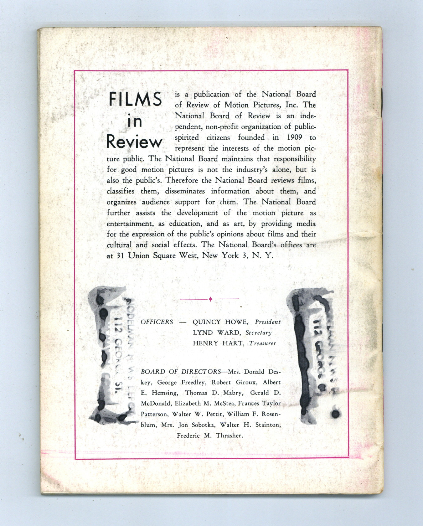 Published Sep 1961 by National Board of Review of Motion Pictures Inc..$11.00- Staple rust: Slight.