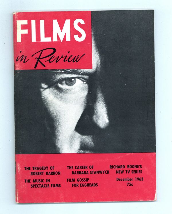 Published Dec 1963 by National Board of Review of Motion Pictures Inc..$9.00Film in Review is a publication of the National Board of Review of Motion Pictures, Inc, an independent, non-profit organization of public citizens founded in 1909 to represent the interests of the motion picture public. This National Board further assists the development of the motion picture as a source of entertainment, as education, and as art, by providing media for the expression of the public's opinion about films and their cultural and social effects. 5 1/2-in. x 7 1/2-in., Cover price $0.75.