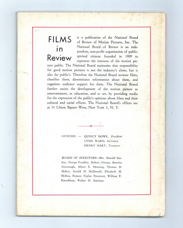 Film in Review is a publication of the National Board of Review of Motion Pictures, Inc, an independent, non-profit organization of public citizens founded in 1909 to represent the interests of the motion picture public. This National Board further assists the development of the motion picture as a source of entertainment, as education, and as art, by providing media for the expression of the public's opinion about films and their cultural and social effects. 5 1/2-in. x 7 1/2-in., Cover price $0.75.