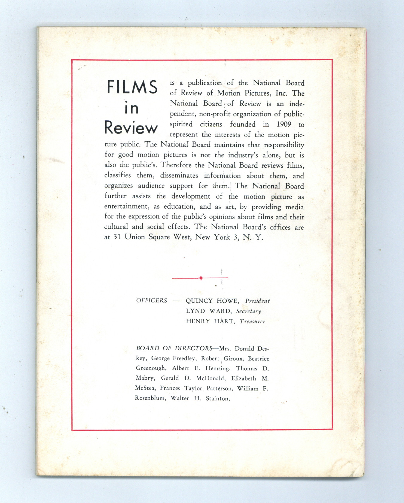 Published Dec 1963 by National Board of Review of Motion Pictures Inc..$5.80- Staple rust: Slight.