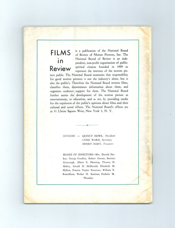 Film in Review is a publication of the National Board of Review of Motion Pictures, Inc, an independent, non-profit organization of public citizens founded in 1909 to represent the interests of the motion picture public. This National Board further assists the development of the motion picture as a source of entertainment, as education, and as art, by providing media for the expression of the public's opinion about films and their cultural and social effects. 5 1/2-in. x 7 1/2-in., Cover price $0.75.