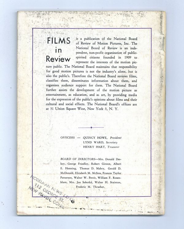 Film in Review is a publication of the National Board of Review of Motion Pictures, Inc, an independent, non-profit organization of public citizens founded in 1909 to represent the interests of the motion picture public. This National Board further assists the development of the motion picture as a source of entertainment, as education, and as art, by providing media for the expression of the public's opinion about films and their cultural and social effects. 5 1/2-in. x 7 1/2-in., 70 pages, B&W. Cover price $0.60.