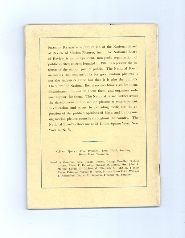 Film in Review is a publication of the National Board of Review of Motion Pictures, Inc, an independent, non-profit organization of public citizens founded in 1909 to represent the interests of the motion picture public. This National Board further assists the development of the motion picture as a source of entertainment, as education, and as art, by providing media for the expression of the public's opinion about films and their cultural and social effects. 5 1/2-in. x 7 1/2-in., 52 pages, B&W. Cover price $0.35.
