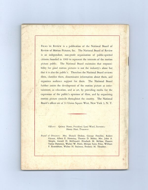 Film in Review is a publication of the National Board of Review of Motion Pictures, Inc, an independent, non-profit organization of public citizens founded in 1909 to represent the interests of the motion picture public. This National Board further assists the development of the motion picture as a source of entertainment, as education, and as art, by providing media for the expression of the public's opinion about films and their cultural and social effects. 5 1/2-in. x 7 1/2-in., 68 pages, B&W. Cover price $0.40.