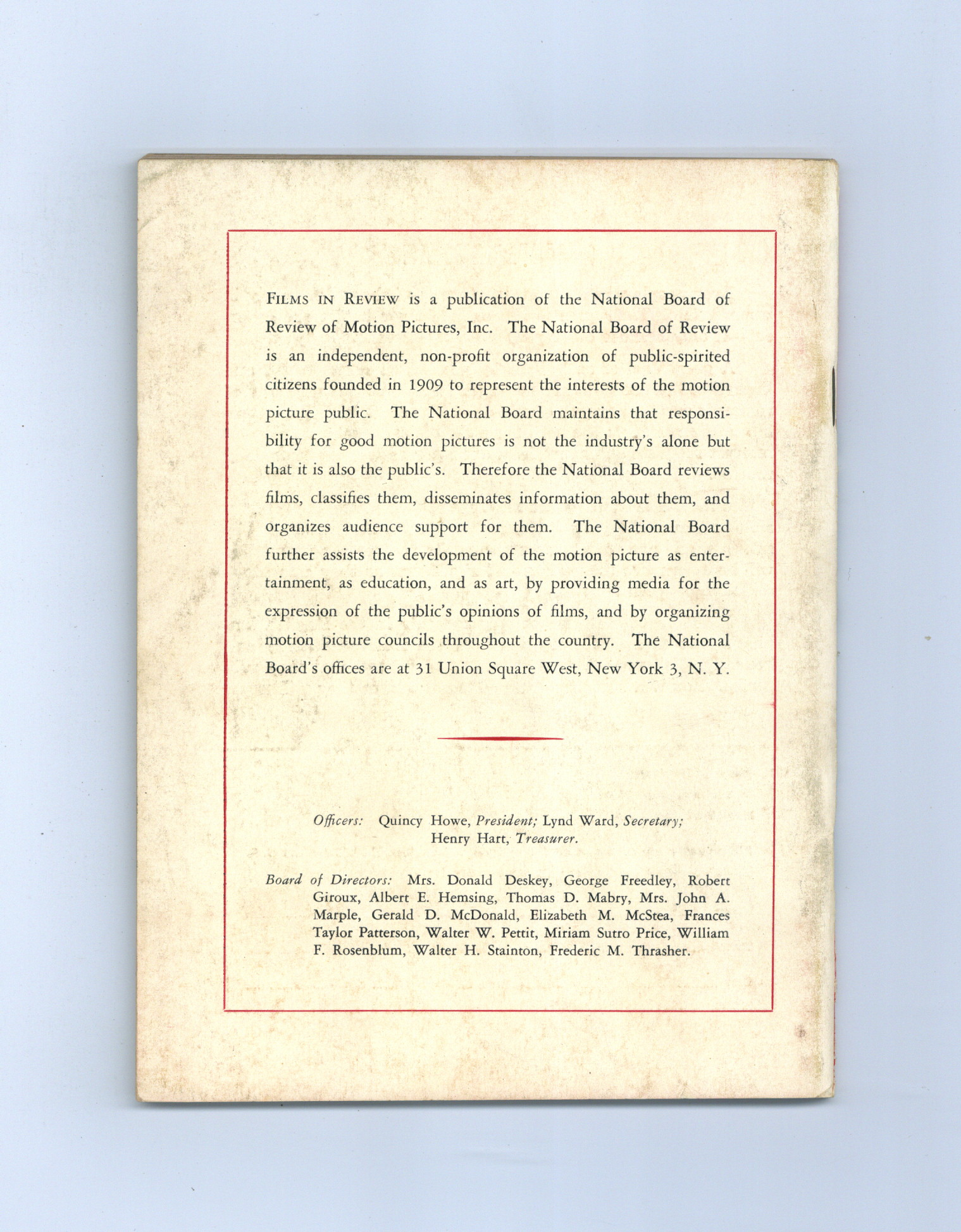 Published Aug 1955 by National Board of Review of Motion Pictures Inc..$20.50- Staple rust: Slight.