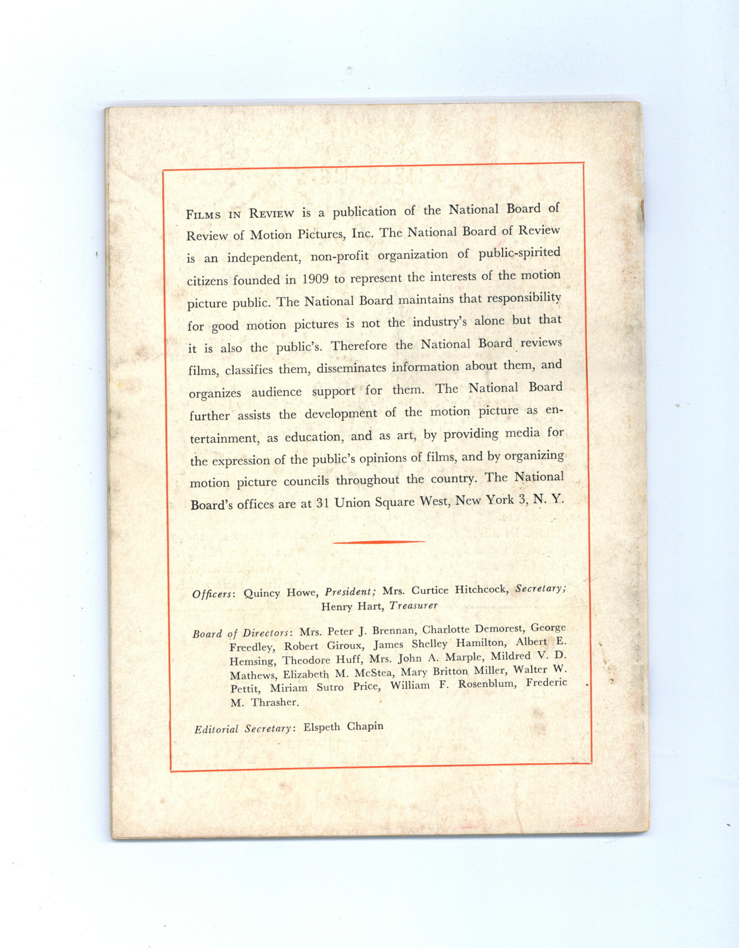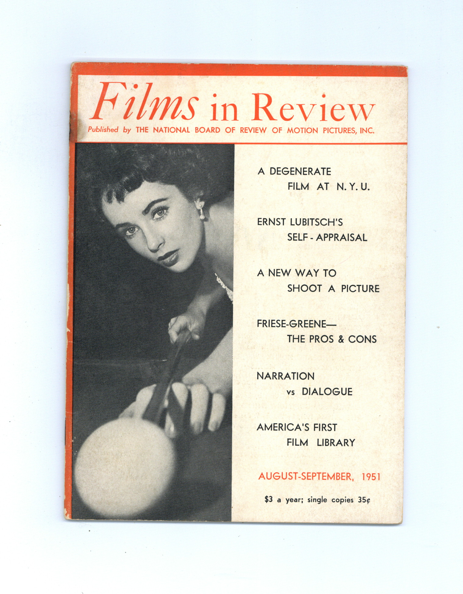Published Aug 1951 by National Board of Review of Motion Pictures Inc..$9.60- Water damage: Moderate. Staple rust: Moderate.