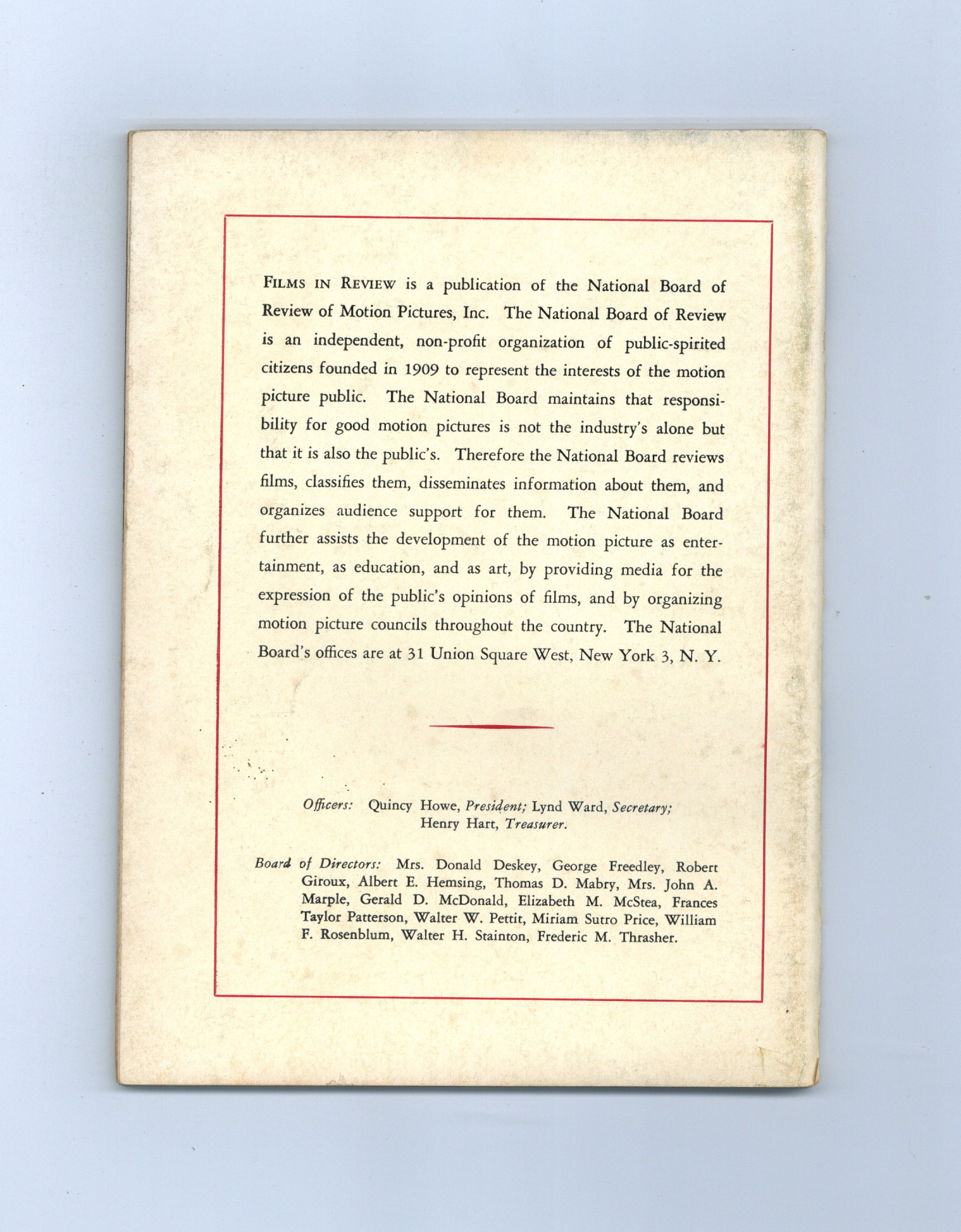 Published Dec 1955 by National Board of Review of Motion Pictures Inc..$10.75Film in Review is a publication of the National Board of Review of Motion Pictures, Inc, an independent, non-profit organization of public citizens founded in 1909 to represent the interests of the motion picture public. This National Board further assists the development of the motion picture as a source of entertainment, as education, and as art, by providing media for the expression of the public's opinion about films and their cultural and social effects. 5 1/2-in. x 7 1/2-in., 52 pages, B&W.