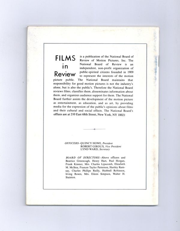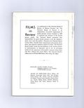 Film in Review is a publication of the National Board of Review of Motion Pictures, Inc, an independent, non-profit organization of public citizens founded in 1909 to represent the interests of the motion picture public. This National Board further assists the development of the motion picture as a source of entertainment, as education, and as art, by providing media for the expression of the public's opinion about films and their cultural and social effects. 5 1/2-in. x 7 1/2-in., 64 pages, B&W. Cover price $1.25.