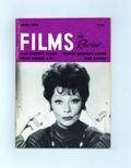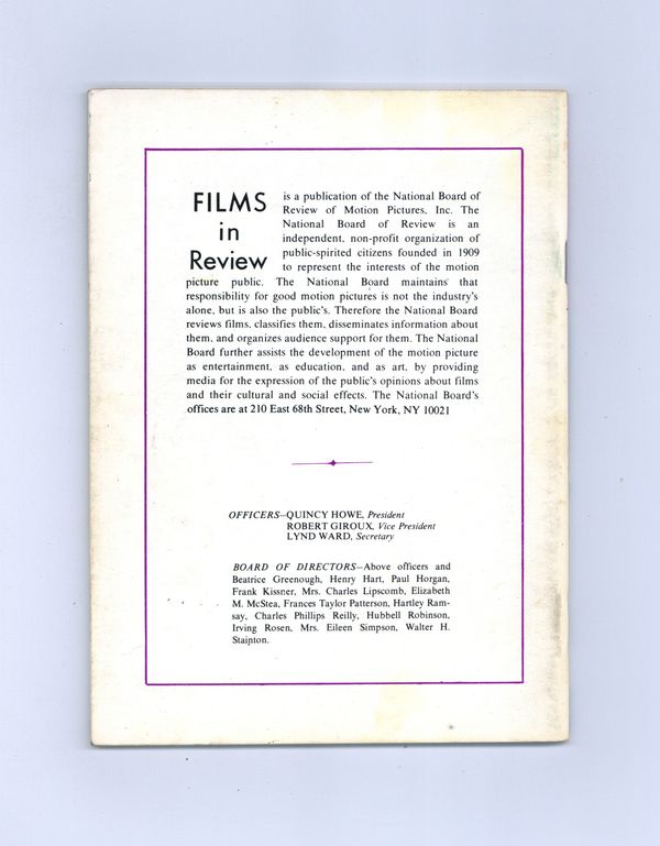 Film in Review is a publication of the National Board of Review of Motion Pictures, Inc, an independent, non-profit organization of public citizens founded in 1909 to represent the interests of the motion picture public. This National Board further assists the development of the motion picture as a source of entertainment, as education, and as art, by providing media for the expression of the public's opinion about films and their cultural and social effects. 5 1/2-in. x 7 1/2-in., 64 pages, B&W. Cover price $1.25.