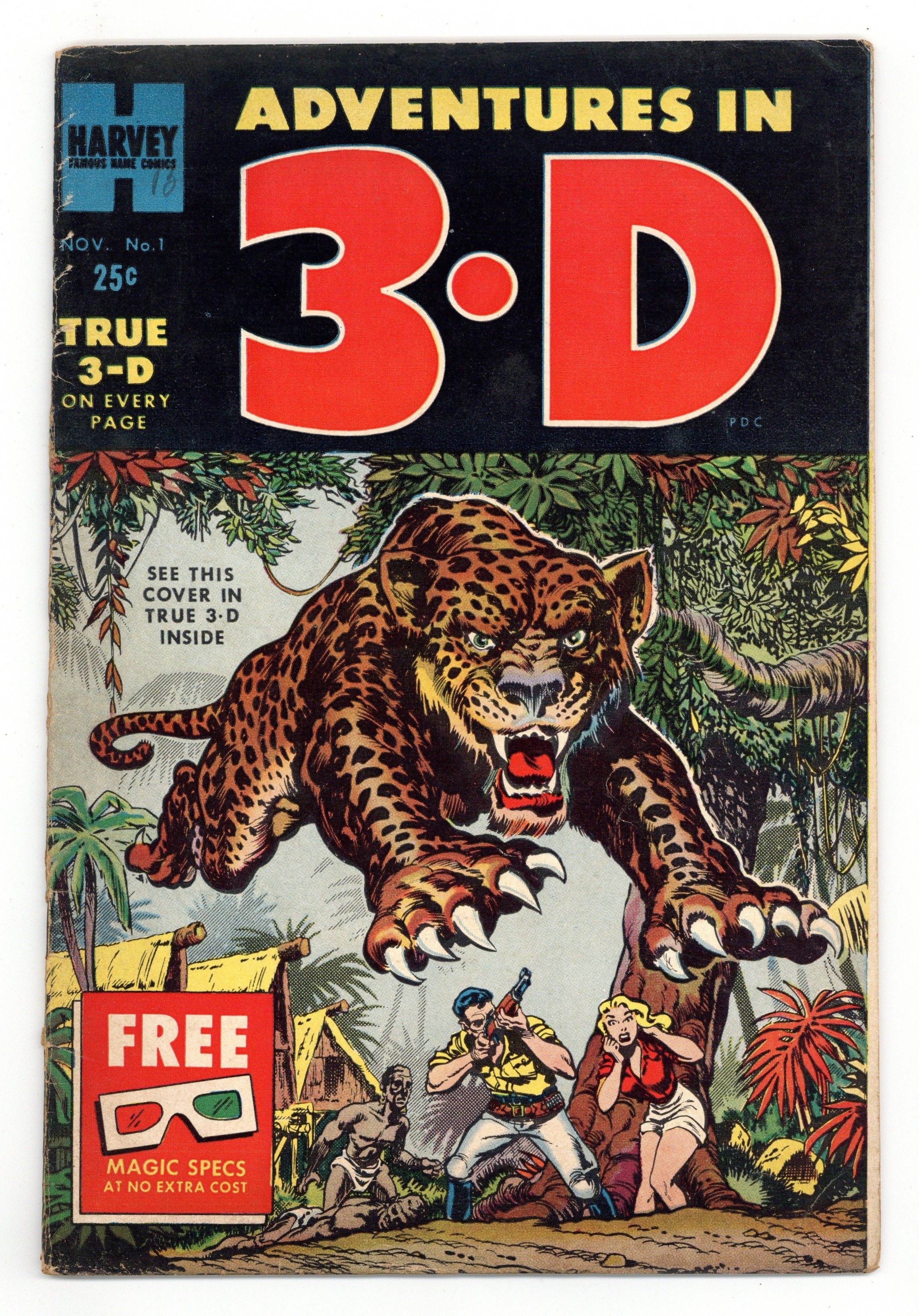 Cover by Howard Nostrand. Stories and art by Bob Powell and Howard Nostrand. A series of 3-D adventure stories, published to coincide with the 3-D craze in movies and comics of the era. The stories include a space-opera, a tale of explorers battling the dangers of the jungle, and a quest to discover the strange mountain creature known as the Snowman. Plus a story that takes advantage of the 3-D technology of the era by telling two separate tales on the same page. Breaking the Time Barrier!; Jungle Drum; Three-D Blinkey; The Hidden Depths; The Snowman; Sand. 36 pages, B&W with 3-D effects. NOTE: Originally distributed with 3-D glasses; may or may not still have them included. Cover price $0.25.