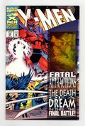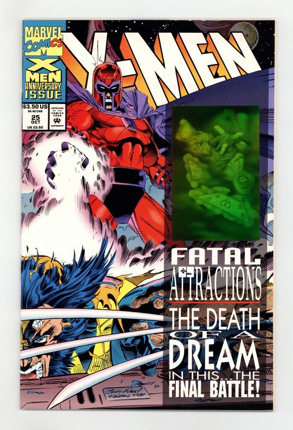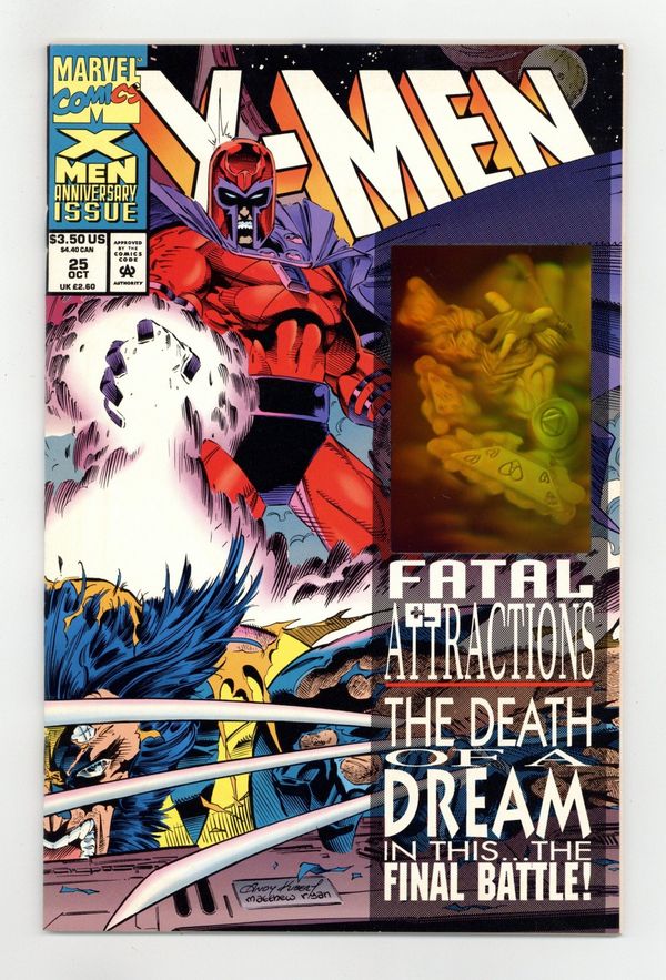 Newsstand Edition. Standard Gambit Hologram Cover by Andy Kubert. 48-page giant; Magneto pulls the adamantium out of Wolverine's body in this issue. Andy Kubert art. Fatal Attractions part 4 of 6: "Dreams Fade." Script by Fabian Nicieza, pencils by Andy Kubert, inks by Matthew Ryan. Cameos by the Thing and Mr. Fantastic (of the Fantastic Four) and Nick Fury. Kubert/Ryan wraparound cover. Cover price $3.50.
