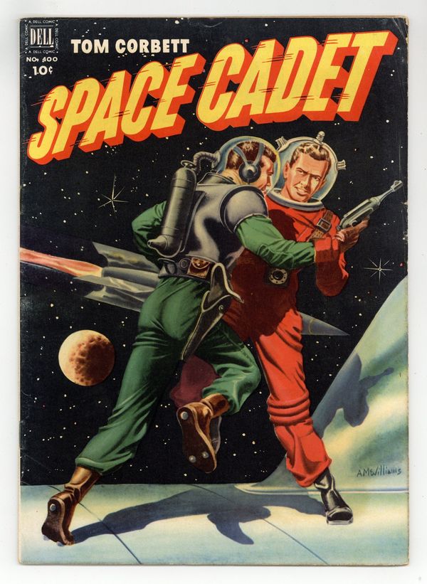 Indicia title is "TOM CORBETT, SPACE CADET, No. 400." Painted cover art by Alden McWilliams. Space Academy: The University of the Planets pledge with photos of Tom Corbett (as played by Frankie Thomas), Astro the Venusian (Al Markim), and Roger Manning (Jan Merlin). Space Pirates of Mercury, script by Paul S. Newman, art by Alden McWilliams; The Space Cadets are on a training mission on the passenger spaceliner "Prince of Centurus" when it is attacked and boarded by space pirates; The pirates take the cargo and also take the passengers and crew to work in the mines of Mercury; Tom, Astro, and Roger secretly slip back into the crippled and abandoned space liner and send a distress call that is picked up by the Solar Guard patrol. 36 pages, full color. Cover price $0.10.