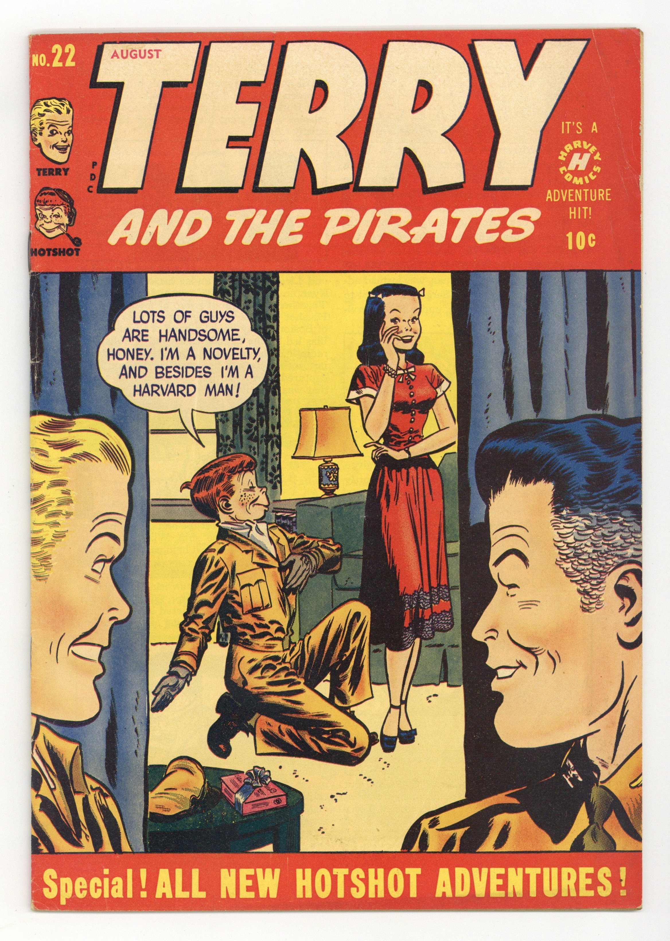 Story and art by Milton Caniff and Lee Elias. Cover by Lee Elias. Harvey reprints Caniffs influential adventure strip about young Terrys adventures in the untamed Orient with two-fisted Pat. With Flip Corkin now in charge of the island, April Kane decides to remain, but Terry and Hotshot volunteer for a new assignment. Hotshot wants to impress his girlfriend by diving off the high dive, but he's not sure he's that brave. Sudden Departure; New Assignment; Air Adventure; Surrender at Dawn; The Adventures of Hotshot Charlie: High Jinks; Drums of Doom. 36 pages, full color. Cover price $0.10.