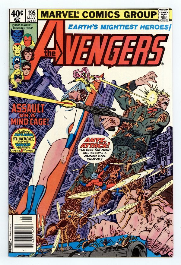 Newsstand Edition. "Assault on a Mind Cage!" Guest-starring Ant-Man. Script by David Michelinie. Pencils by George Perez. Inks by Jack Abel and Dan Green. Cover by George Perez and Dan Green. The Wasp has taken it upon herself to invade the Solomon Institute and find out what's going on inside! Unfortunately though, it's been several hours since anyone's heard from her! So Yellowjacket and Ant-Man (aka Scott Lang) infiltrate the institute, while the remaining avengers wait outside in the snow! The three insect-size heroes are having an easy time defeating all the guards in the asylum, but their fortunes dramatically change when the institute's head honcho arrives...the Taskmaster! First (cameo) appearance of the Taskmaster. Avengers Lineup: Beast, Captain America, Iron Man, Jocasta, Ms. Marvel, Vision, Wasp, Wonder Man, and Yellowjacket. 36 pages Cover price $0.40.