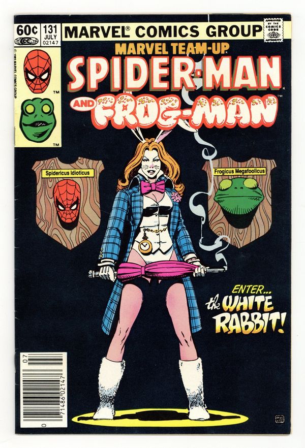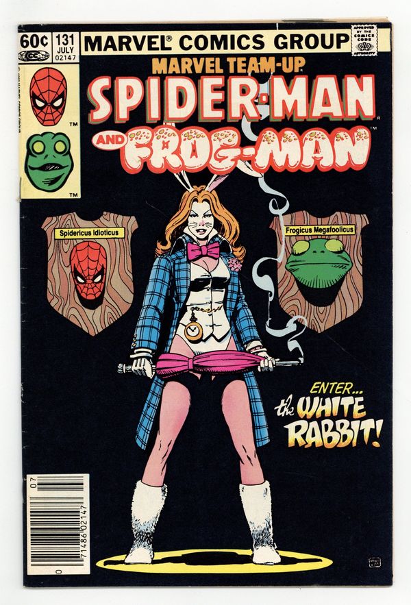 Newsstand Edition. "The Best Things In Life Are Free...But Everything Else Costs Money!". Guest-starring Spider-Man and Frog-Man. Script by J.M. DeMatteis. Pencils by Kerry Gammill. Inks by Mike Esposito. Cover by Paul Smith. Eugene Palilio had such a great time playing Frog-Man (in Marvel Team-Up 121) he decides that it's time for another adventure! When an opportunity presents itself during a restaurant robbery, Frog-Man springs into action! Predictably, Eugene gets in over his head against the White Rabbit, so the web-slinger swoops in to rescue his besieged friend! After another close life-and-death call, Eugene will probably wise up and retire...or will he? Not as long as the White Rabbit is on the loose! First appearance of the White Rabbit. Flashback cameo by Daredevil. 36 pages. Cover price $0.60.