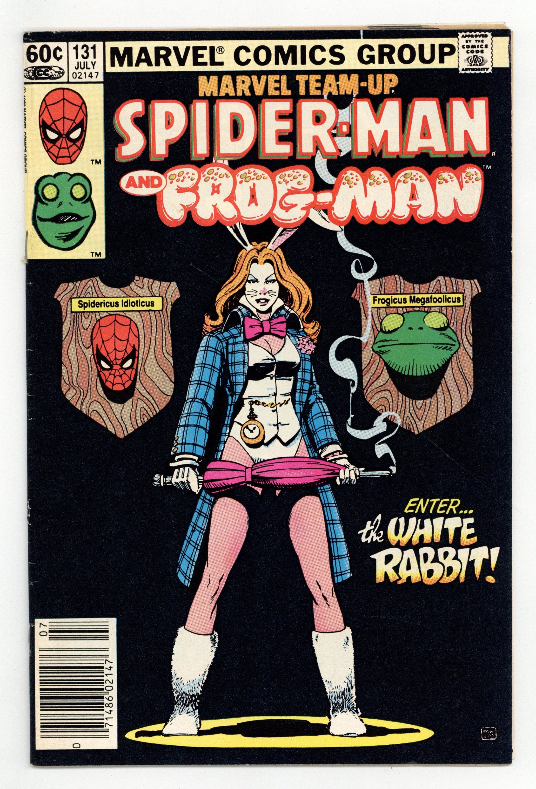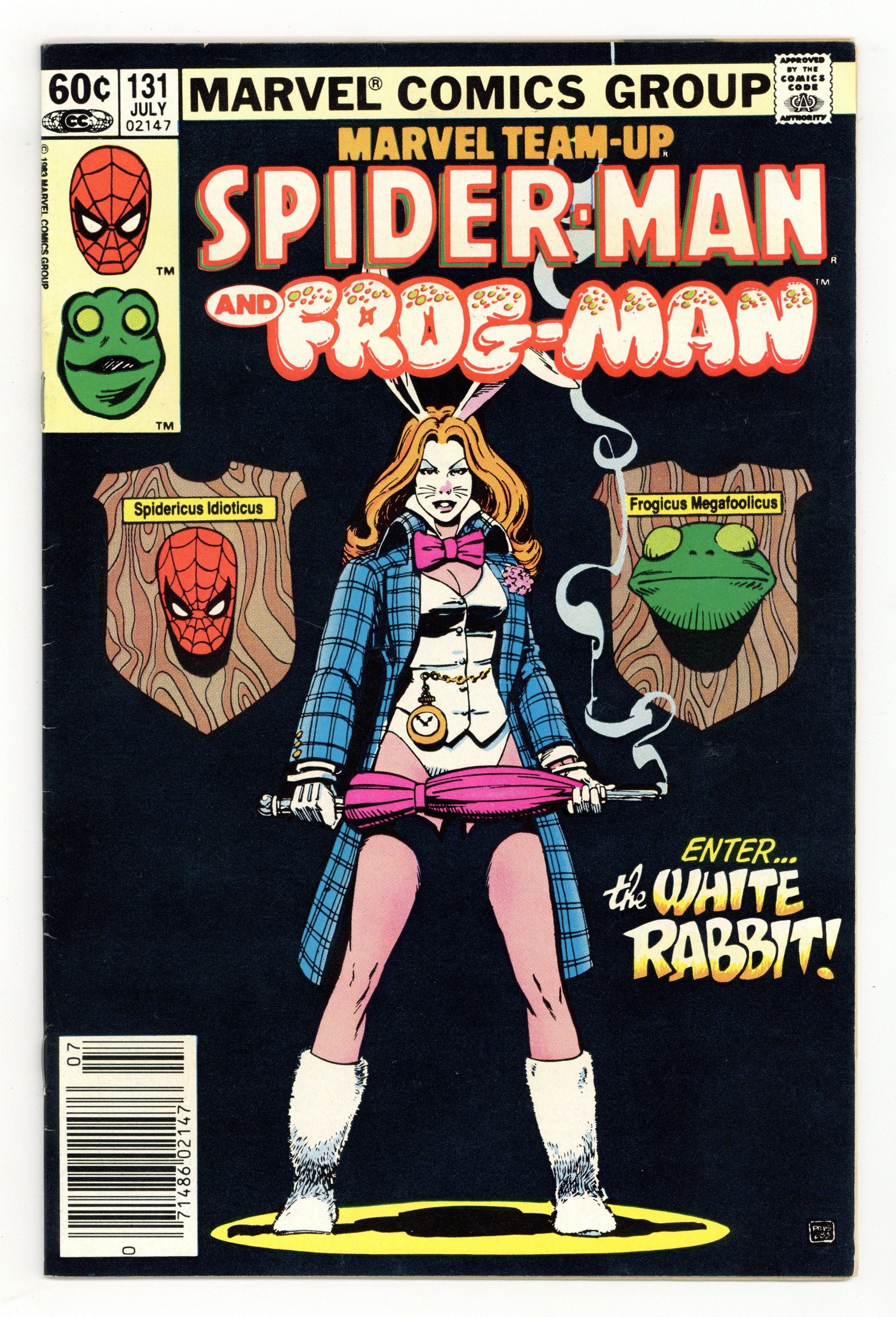 Tags: Spider-Man$16.00Newsstand Edition. "The Best Things In Life Are Free...But Everything Else Costs Money!". Guest-starring Spider-Man and Frog-Man. Script by J.M. DeMatteis. Pencils by Kerry Gammill. Inks by Mike Esposito. Cover by Paul Smith. Eugene Palilio had such a great time playing Frog-Man (in Marvel Team-Up 121) he decides that it's time for another adventure! When an opportunity presents itself during a restaurant robbery, Frog-Man springs into action! Predictably, Eugene gets in over his head against the White Rabbit, so the web-slinger swoops in to rescue his besieged friend! After another close life-and-death call, Eugene will probably wise up and retire...or will he? Not as long as the White Rabbit is on the loose! First appearance of the White Rabbit. Flashback cameo by Daredevil. 36 pages. Cover price $0.60.