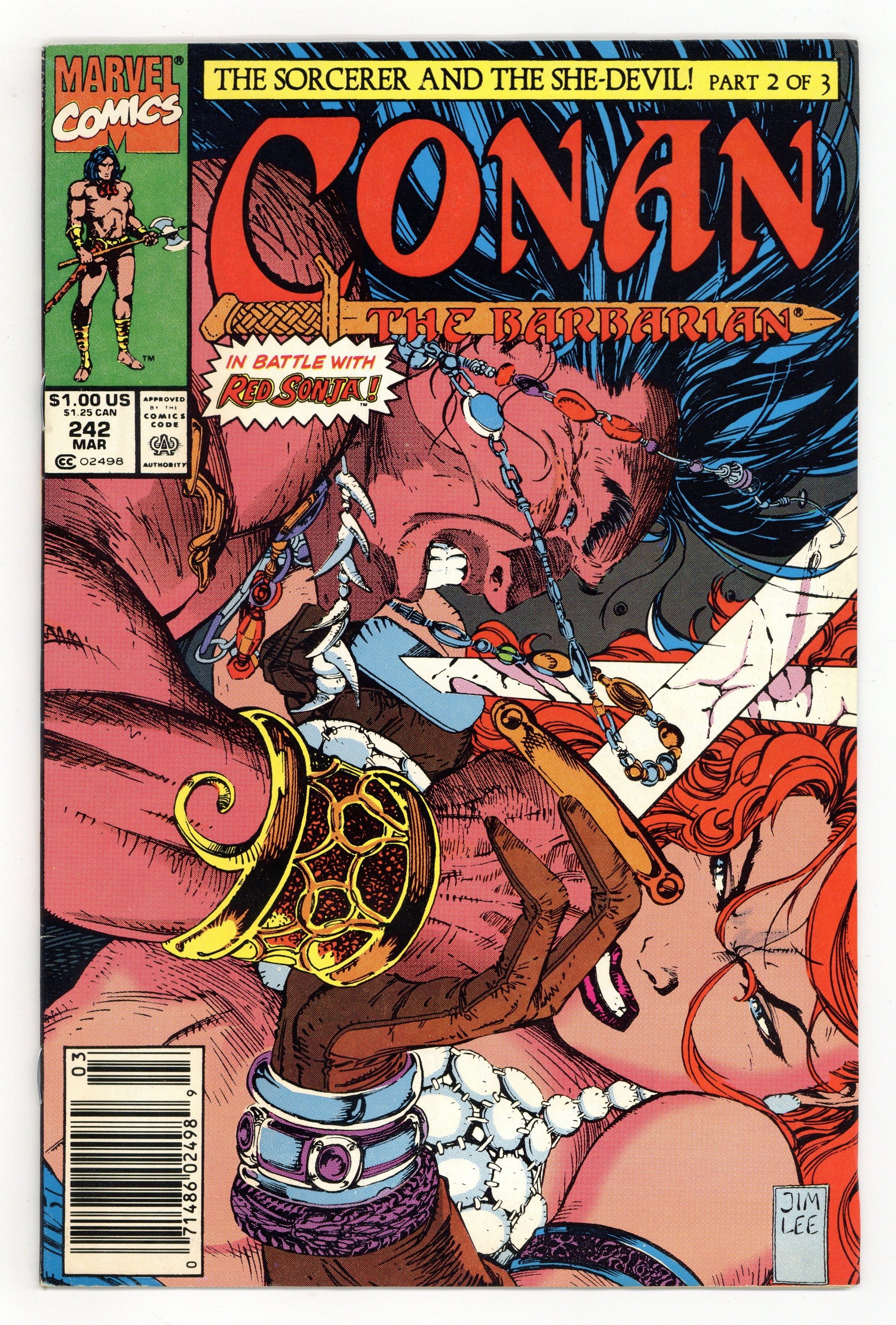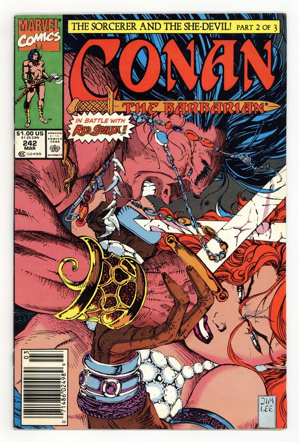 Newsstand Edition. Cover art by Jim Lee. They Came To Castle Zukala, script by Roy Thomas, pencils by Gary Hartle, inks by Mike DeCarlo; Conan, Red Sonja and Karanthes arrive at El-Ron's castle for the wedding of El-Ron and Red Sonja; El-Ron's past is revealed and Conan is taken by Jagga-Nota to his home dimension; "The Sorceror and the She-Devil" part 2. Letters page has information on Robert E. Howard's Hyborian lands. 36 pgs. Cover price $1.00. Cover price $1.00.
