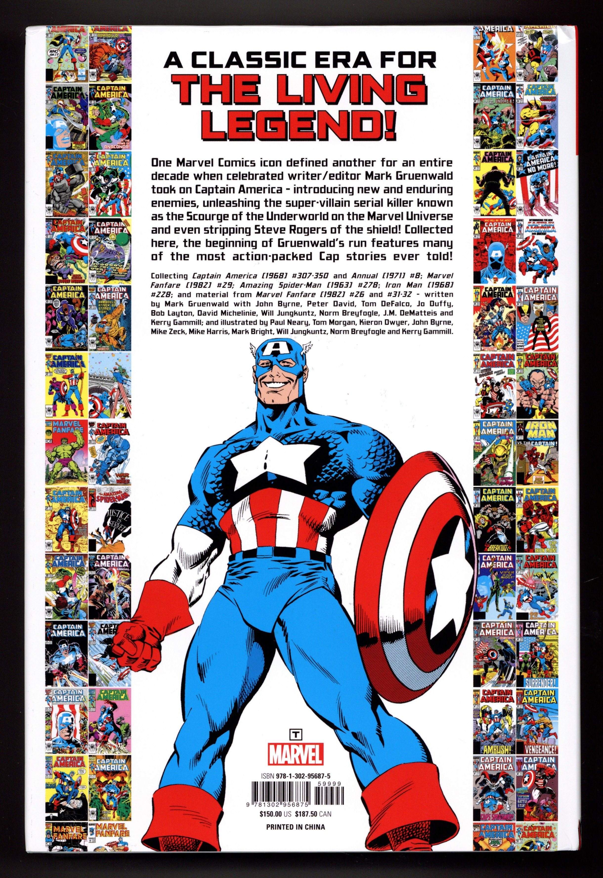 Volume 1 - 1st printing. Collects Captain America (1968-1996 1st Series) #307-350 and Captain America (1968-1996 1st Series) Annual #8, The Amazing Spider-Man (1963-1998 1st Series) #278, Iron Man (1968-1996 1st Series) #228, and material from Marvel Fanfare (1982-1992 1st Series) #26, 29 and 31-32. Written by Mark Gruenwald, John Byrne, J.M. DeMatteis, Will Jungkuntz, Norm Breyfogle, Tom DeFalco, Peter David, Mary Jo Duffy, Kerry Gammill, Bob Layton, and David Michelinie. Art by Paul Neary, John Byrne, Mike Harris, Mike Zeck, Kerry Gammill, Tom Morgan, Kieron Dwyer, Mark Bright, Will Jungkuntz, Norm Breyfogle, Dennis Janke, Al Williamson, Joe Sinnott, Vince Colletta, John Beatty, Sam De La Rosa, Bob McLeod, Dave Hunt, Tony DeZuniga, Bob Layton, Al Milgrom, Bob Wiacek, Joe Rubinstein, Kent Williams, Jose Marzan, Jr. Cover by Mike Zeck and John Beatty. Back Cover by Kieron Dwyer and Al Milgrom. Introduction by Ralph Macchio. Commencing one of the longest [and greatest] comic book creative runs of all time! Mark Gruenwald's decade-long stint as writer of CAPTAIN AMERICA begins with unforgettable battles against Madcap, Flag-Smasher and the newly-formed Serpent Society! But things really kick into high gear when the serial killer known as the Scourge of the Underworld targets villains across the Marvel Universe, marking every death with an enigmatic epitaph: "Justice is served!" As the bodies pile up, can Cap find and stop Scourge before there are no more criminals left to fight? There's also Wolverine and the misguided Super-Patriot to contend with - but the government itself might strike the final blow against the Sentinel of Liberty! As a volatile vigilante is chosen to replace him, Steve Rogers retires as Captain America...but he's not out of the fight just yet! Includes the Scourge subplot pages from Iron Man (1968-1996 1st Series) #194, The Thing (1983-1986 1st Series Marvel) #24 and 33, Secret Wars II (1985 Marvel) #2, Thor (1962-1996 Marvel 1st Series Journey Into Mystery) #358, The Avengers (1963-1996 1st Series) #263, Fantastic Four (1961-1996 1st Series) #289, and The Amazing Spider-Man (1963-1998 1st Series) #276. Hardcover. 8 1/2-in. x 11-in., 1,336 pages, full color. Rated T Cover price $150.00.